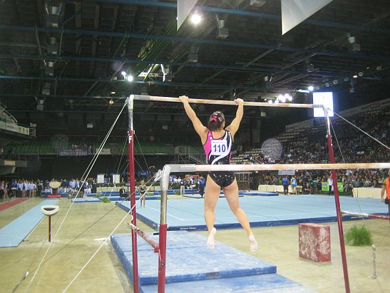 Agli staggi delle parallele asimmetriche dobbiamo far purtroppo di necessità virtù! Ora tocca a Veronica che, a parte una breve pausa sullo staggio alto, affronta questo attrezzo con la stoica determinazione di chi ha voglia di saldare un conto personale con il fato che la vede da più di un anno “mordere il freno”. Seguono rispettivamente Joelle Elisabeth Mattoni che con la sua regolarità, nonostante la sua spalla dolorante, chiude l’esercizio con un doppio carpio e Jessica Hélène Mattoni che ritorna in gara fra gli staggi dopo più di un anno di assenza, così come al volteggio, a seguito del grave infortunio occorsole, chiudendo con un sorriso verso quel CIELO a cui tutto dobbiamo.