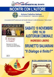SAN BENEDETTO DEL TRONTO – In questo anno in cui si celebra il 50° del Concilio vaticano II nuemrose sono le iniziative che l’Azione Cattolica promuove. L’Azione Cattolica della diocesi di San Benedetto ha invitato il 10 novembre Brunetto Salvarani, proponendo una riflessione sul tema del Dialogo a partire da uno dei documenti del Concilio: la dichiarazione Nostra Aetate sul rapporto della Chiesa con le altre religioni.