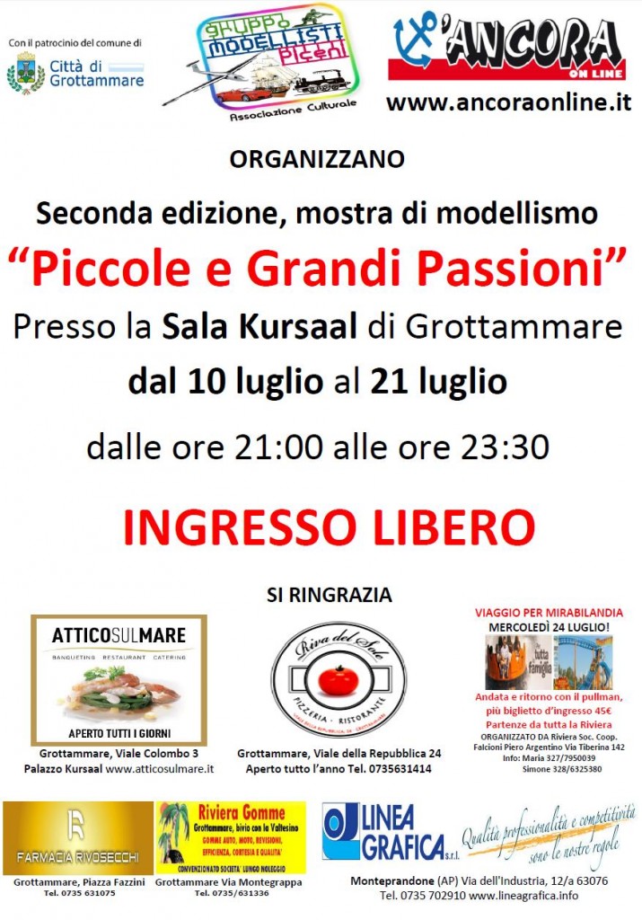 GROTTAMMARE – Grande attesa per l’apertura della mostra: “Piccole e grandi Passioni”, che avverrà mercoledì 10 luglio ed organizzata dal giornale l’Ancoraonline.it e dal gruppo modellisti Piceni.