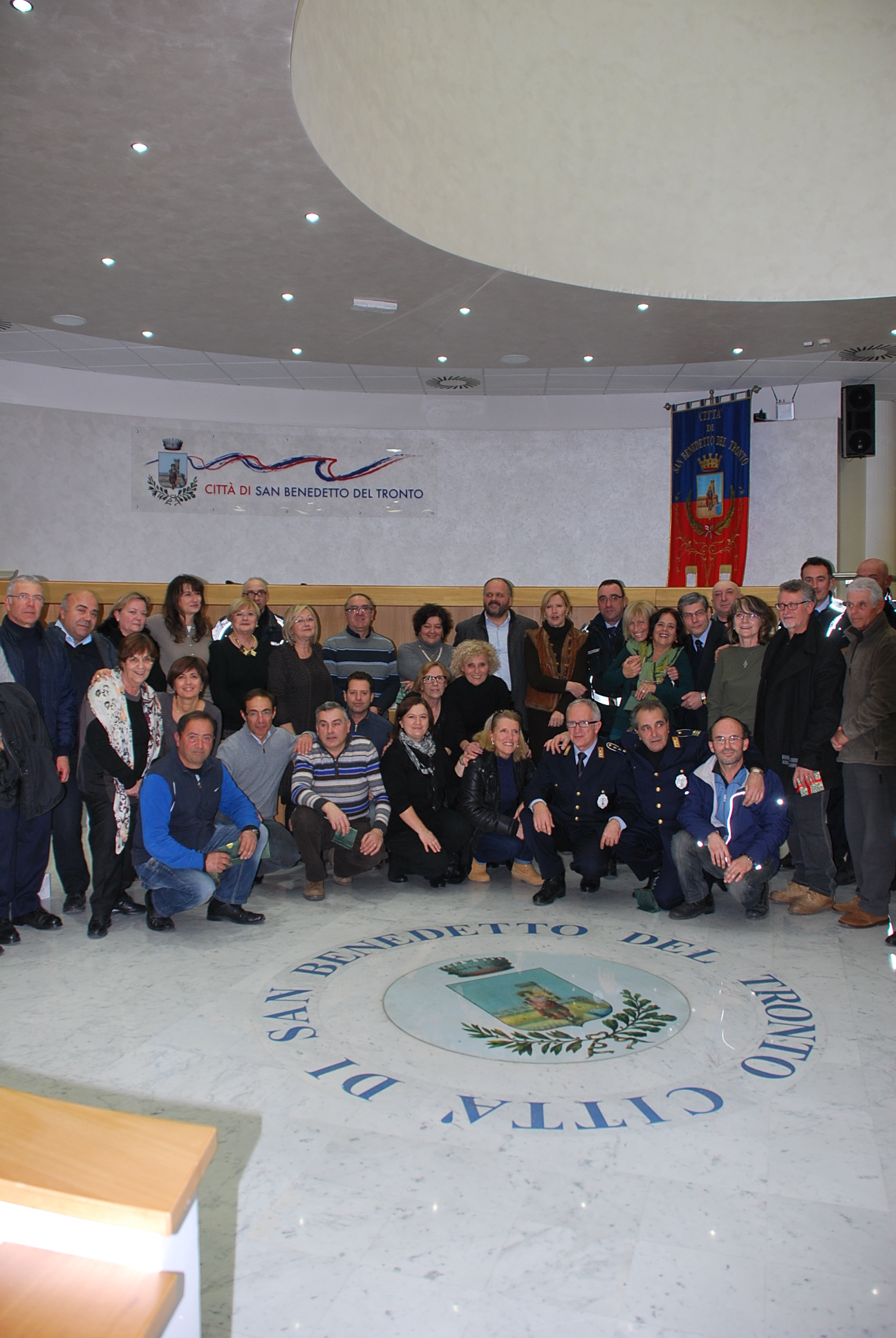 SAN BENEDETTO DEL TRONTO – Come consuetudine, prima delle festività natalizie, questa mattina, giovedì 19 dicembre, si è svolta in sala consiliare la tradizionale cerimonia di premiazione dei dipendenti comunali che sono andati o andranno in pensione entro il 2013. Sono otto i dipendenti che hanno ricevuto dalle mani del sindaco Giovanni Gaspari un piccolo dono in segno di riconoscenza per il lavoro svolto: Anna Antonelli, Franca Antonini, Piero Bernardini, Giuseppe Bruni, Maria Adele Ricci, Quirico Scipioni, Filippo Sgattoni, Vincenzo Carfagna.