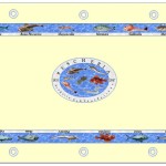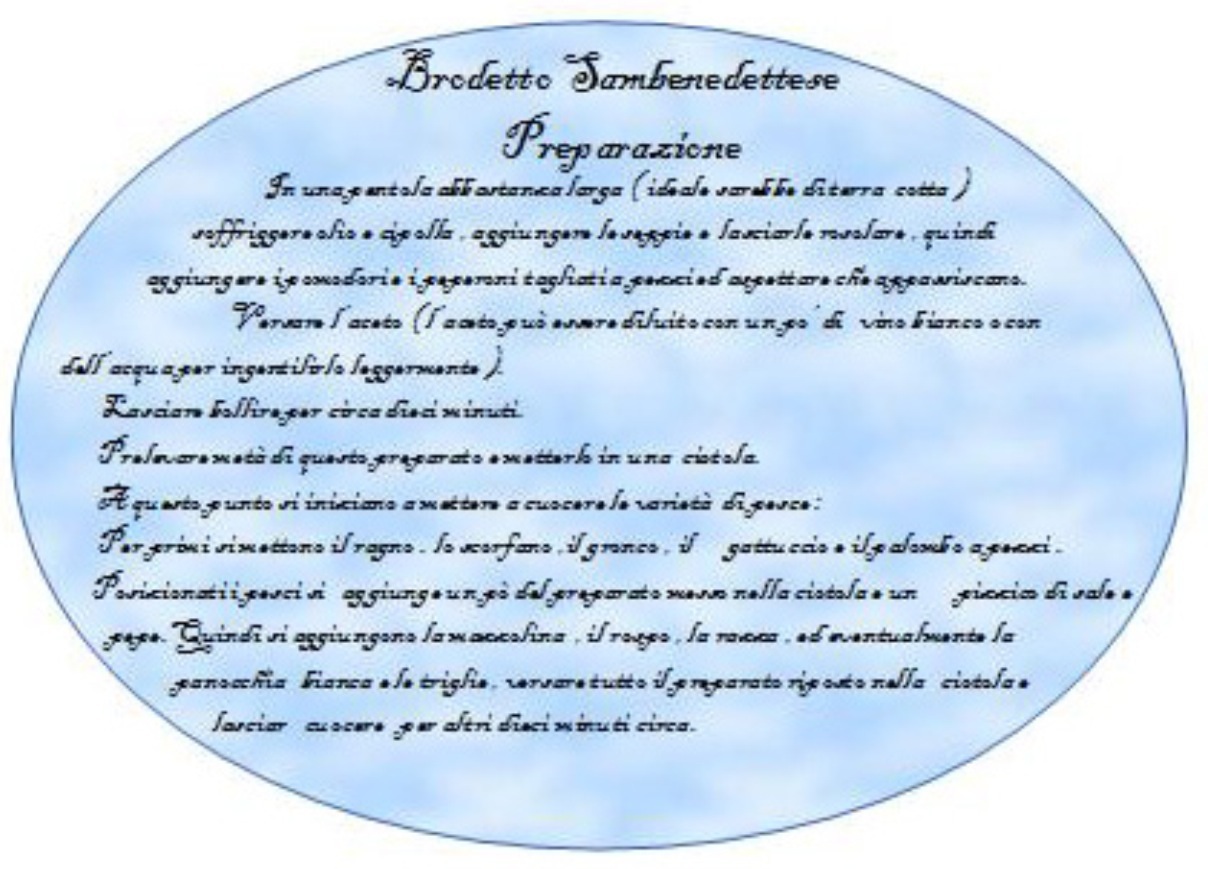 Sopra al mosaico centrale,appeso al soffitto un elemento,della forma e dimensione del piatto a terra,di materiale trasparente,che quindi non occulti alla vista la copertura,opportunamente inclinato rispetto alla superficie del pavimento per permetterne meglio la lettura.Una sorta di installazione sulla quale incidere per esteso la ricetta e la relativa modalità di preparazione del Brodetto Sambenedettese.