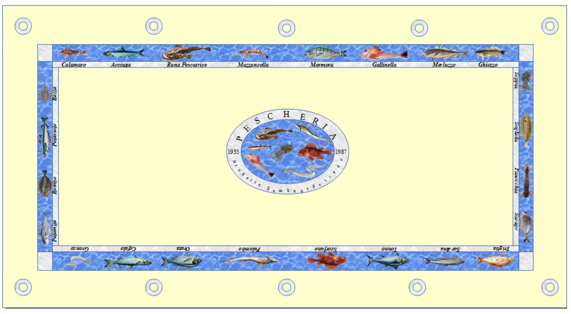 Al centro della pavimentazione ricavare un’ellisse costituito da una cornice esterna nella quale incidere nella parte superiore la scritta “ PESCHERIA 1935 – 1987 “ per ricordare la destinazione d’uso dell’area e gli anni di inizio e fine dell’attività di vendita del pesce,e nella parte inferiore la scritta “ BRODETTO SAMBENEDETTESE “,ed una parte interna realizzata con pavimento a mosaico nella quale rappresentare le specie ittiche utilizzate nel brodetto Sambenedettse.