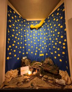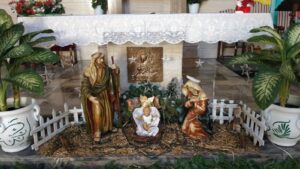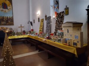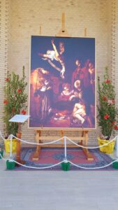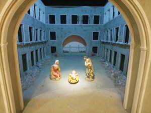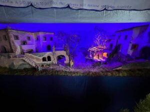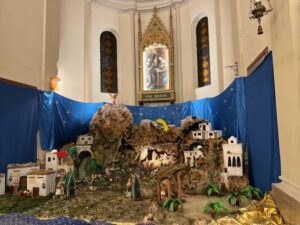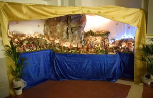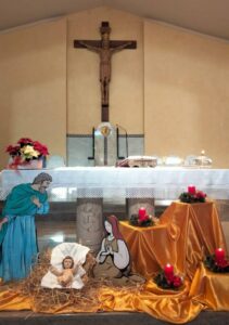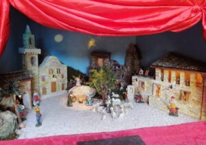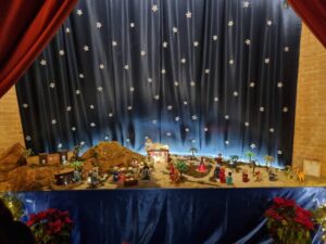 Iniziamo dunque il nostro viaggio alla scoperta dei presepi della Diocesi di San Benedetto del Tronto – Ripatransone – Montalto partendo da quelli realizzati nella Vicaria di San Giacomo della Marca il cui Vicario Foraneo, don Anselmo Fulgenzi, dichiara: “In occasione del Natale 2023, come lo scorso anno, sul porticato della Chiesa del Sacro Cuore di Martinsicuro, campeggia una riproduzione della Natività del Caravaggio.