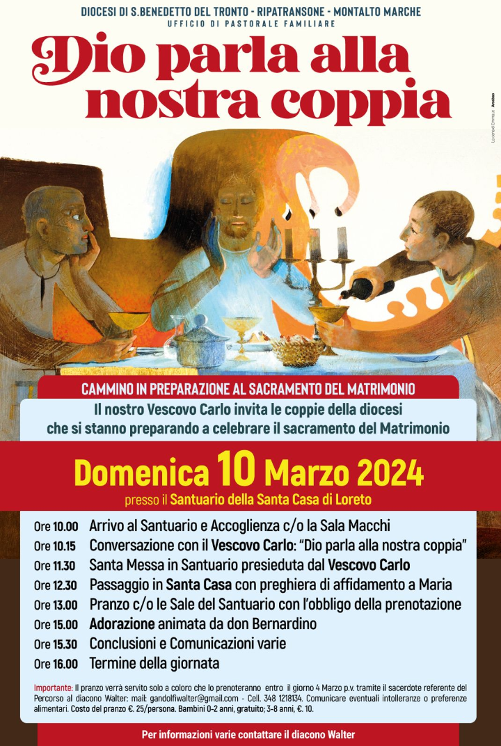 Nell’esortazione apostolica “Amoris laetitia”, si legge: “La Parola di Dio è fonte di vita e di spiritualità per la famiglia […], la Parola di Dio non solo è una buona novella per la vita privata delle persone, ma anche un criterio di giudizio e una luce per il discernimento delle diverse sfide con cui si confrontano i coniugi e le famiglie”. A tale proposito la Diocesi di San Benedetto del Tronto – Ripatransone – Montalto Marche, Ufficio di Pastorale familiare, ha organizzato per domenica 10 marzo presso il Santuario Basilica della Santa Casa di Loreto, una giornata dedicata alle coppie che stanno frequentando il cammino in preparazione al Sacramento del matrimonio.