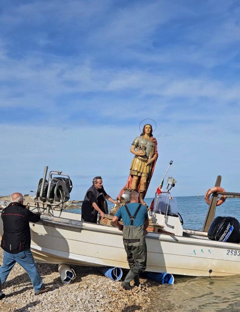 Quando la statua del Santo è stata caricata su una vongolara addobbata a festa, pronta per dirigersi verso San Benedetto del Tronto, il suono della sirena dell’imbarcazione ha riecheggiato nell’aria, seguito da un fragoroso applauso dei presenti a riva, segnando l’inizio della navigazione.