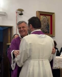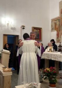 Al rito di pace, don Riccardo, dopo aver abbracciato il vescovo Gianpiero, si è recato tra i banchi per scambiare con i fedeli il segno di pace.