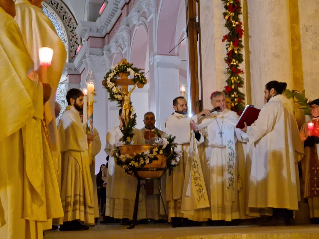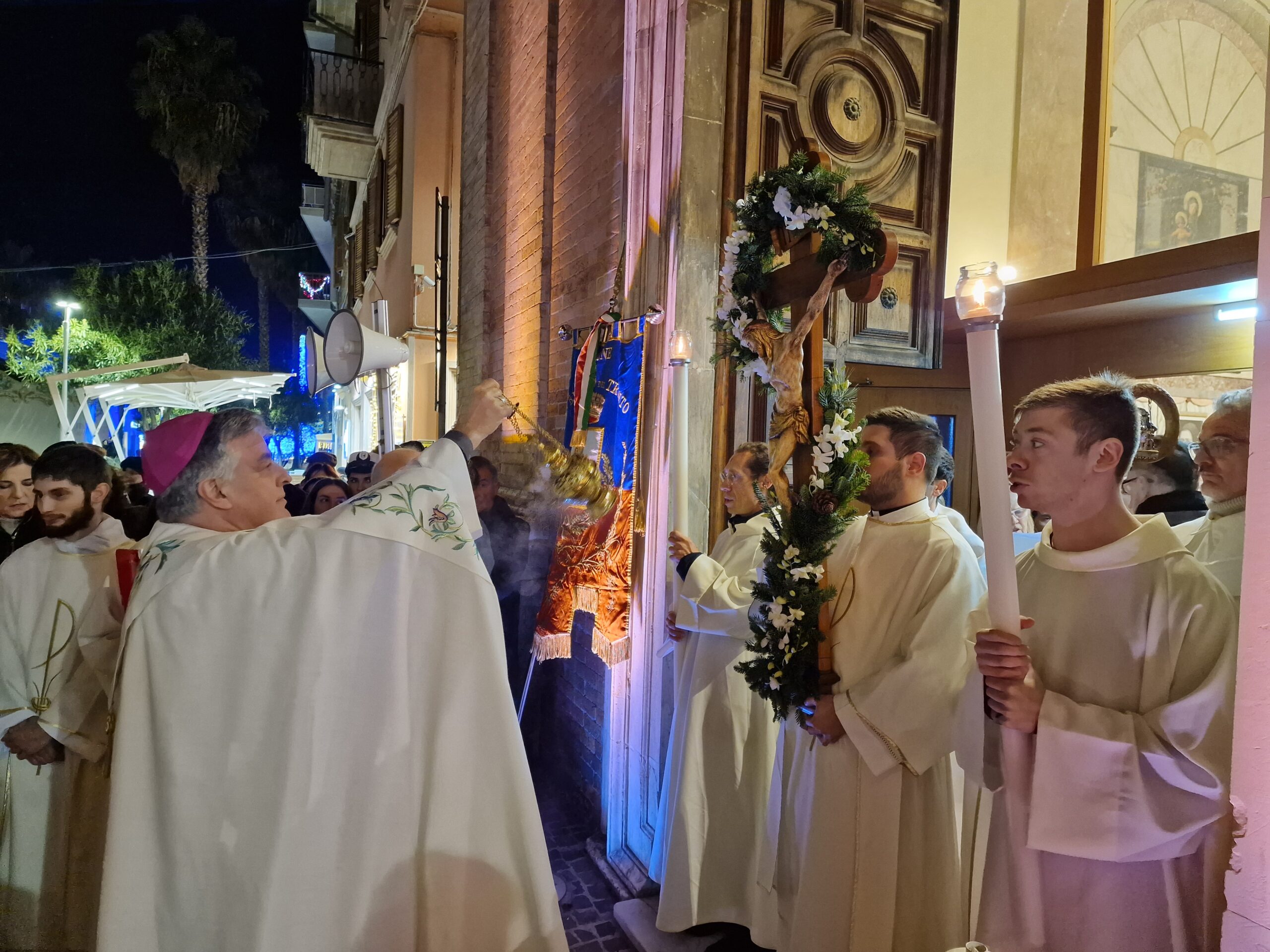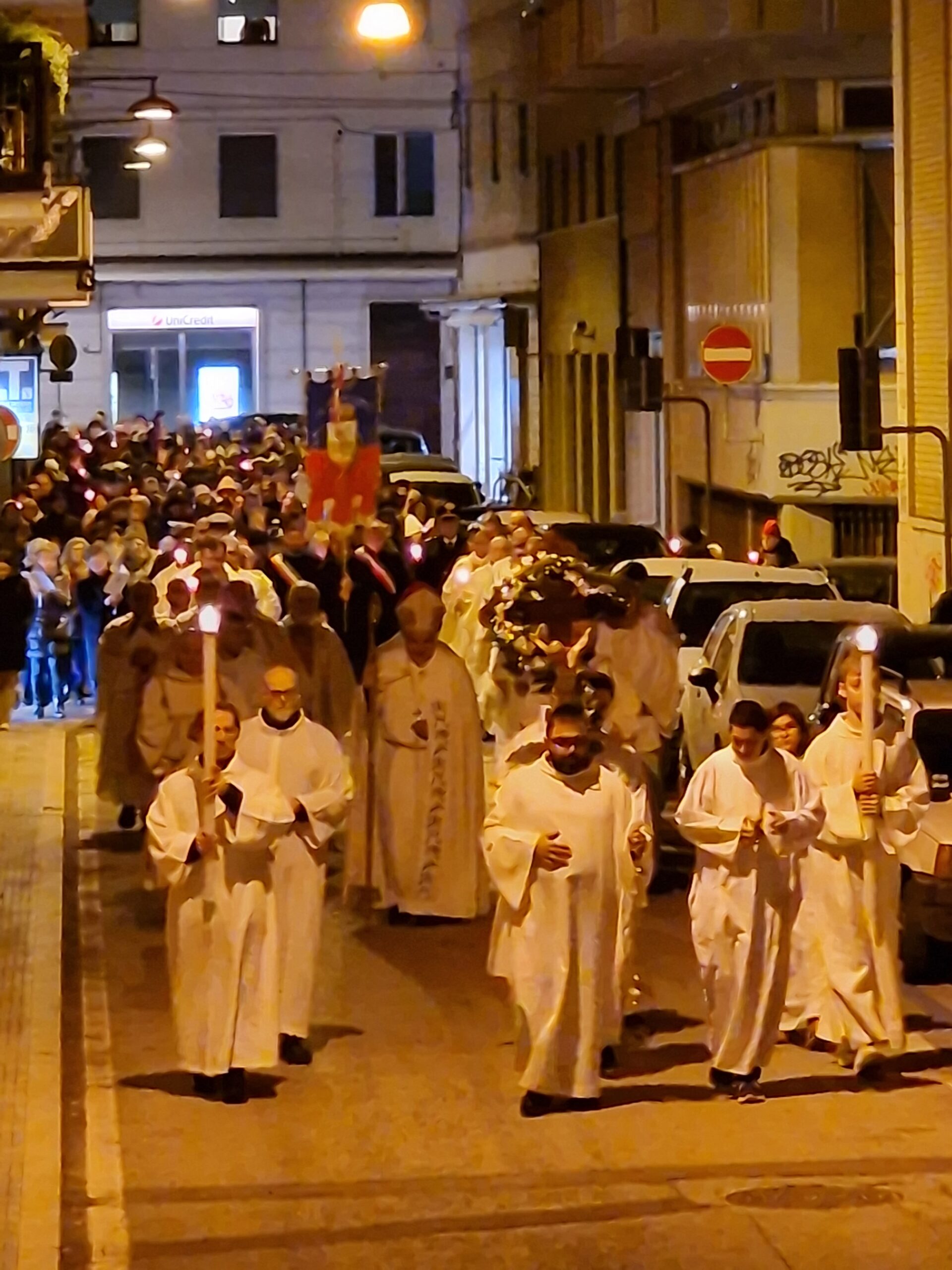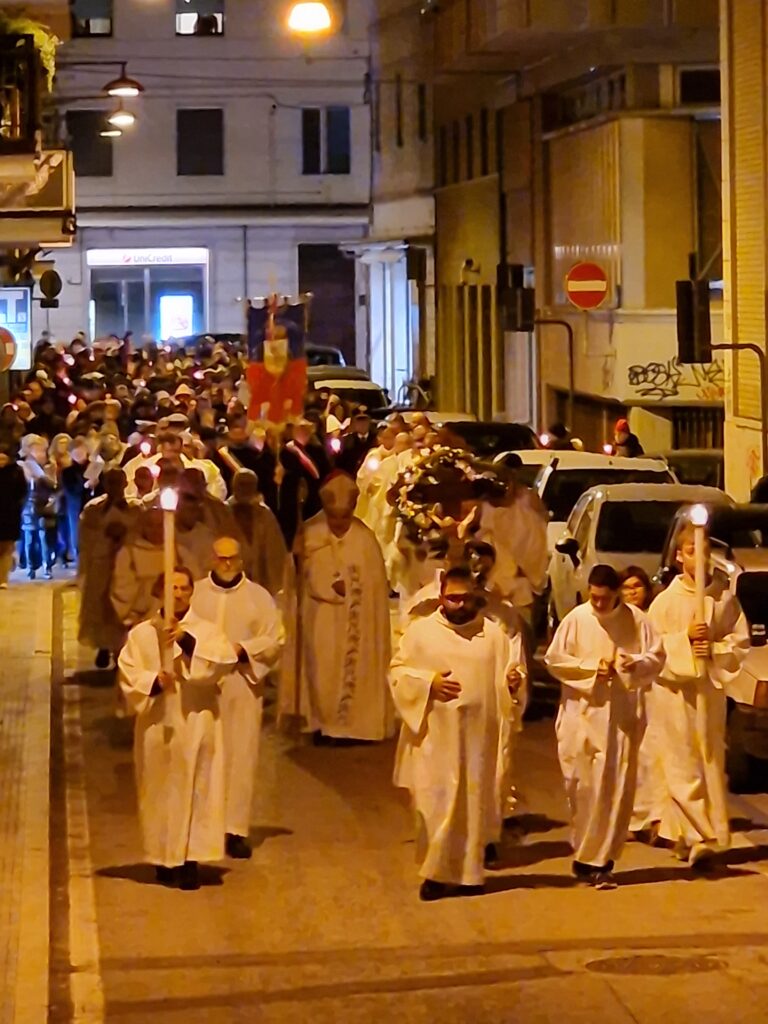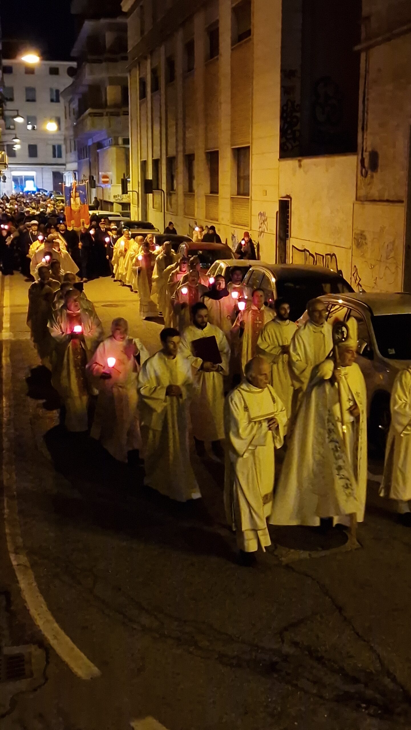 Al termine della lettura, il vicario generale don Patrizio Spina ha acceso una candela dalla luce di Betlemme e, a sua volta, ha acceso le candele di altri fedeli presenti. Quando tutti sono riusciti ad accendere le proprie candele, è iniziato il pellegrinaggio verso la cattedrale Santa Maria della Marina, durante il quale i fedeli hanno cantato le litanie dei Santi e pregato alcuni Salmi. I numerosi fedeli hanno camminato, composti ed in preghiera, dietro al Vangelo, mettendo i loro piedi dove Gesù ha lasciato le sue orme.