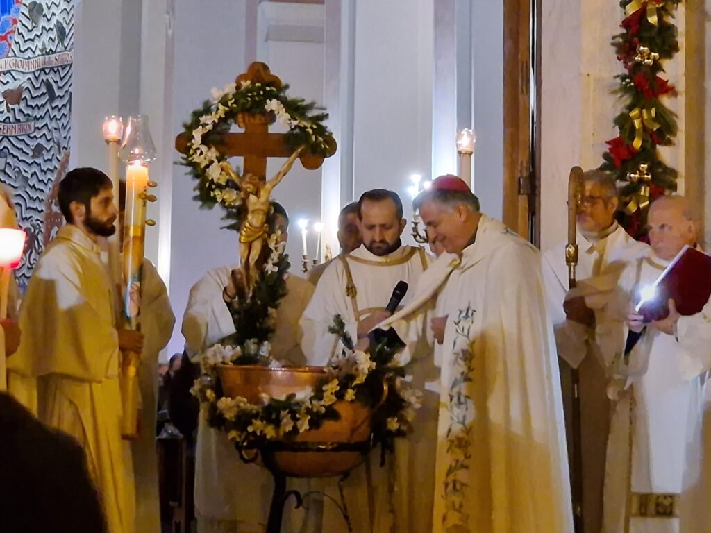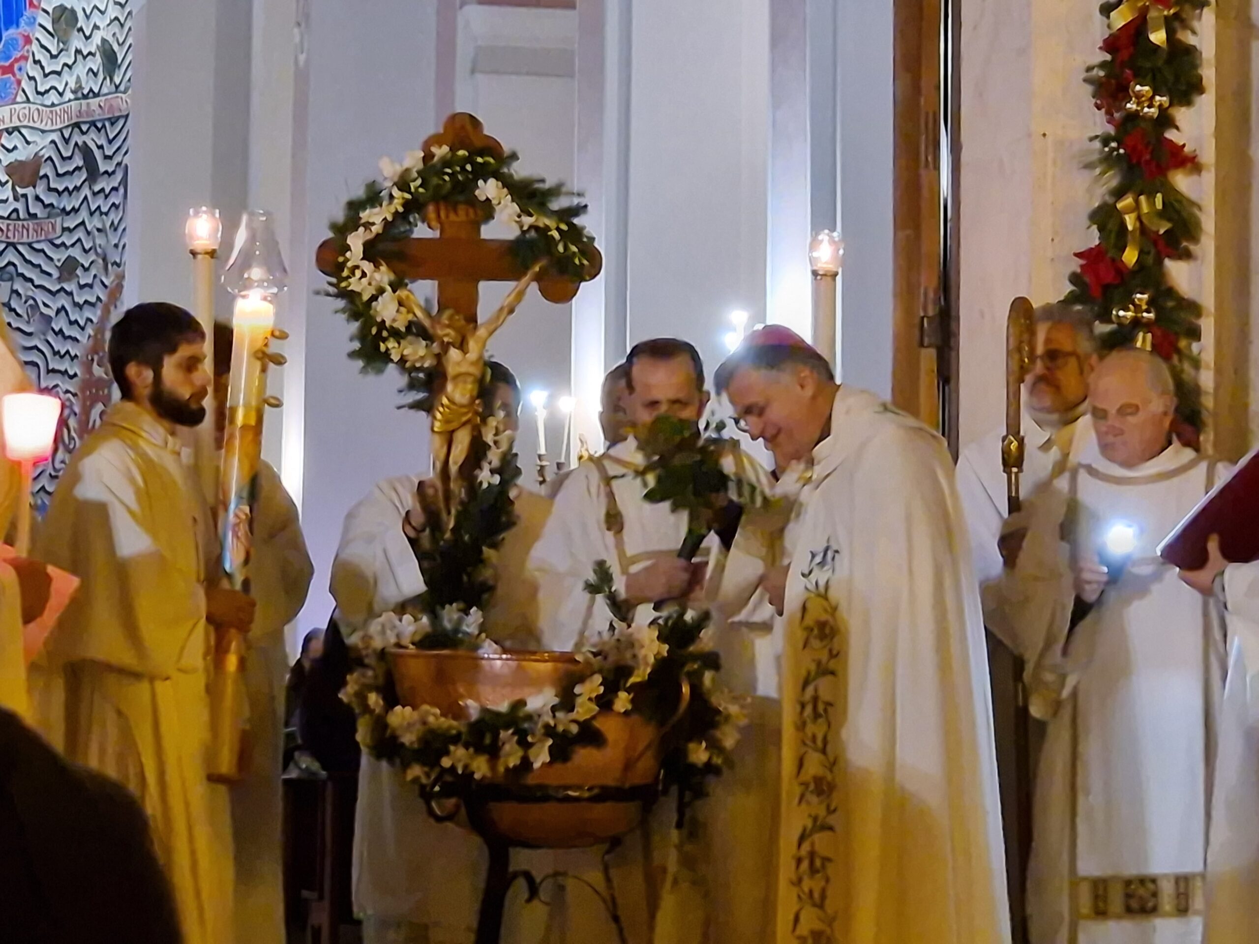 Dopo un momento di silenzio, il vescovo Gianpiero ha ricordato ai fedeli che, per la grazia del Mistero Pasquale, siamo stati sepolti insieme con Cristo nel Battesimo, per camminare con lui in una vita nuova. Ha quindi invitato tutti i presenti a rinnovare le promesse battesimali con le quali un giorno abbiamo rinunciato a Satana e alle sue opere e ci siamo impegnati a vivere e a servire Dio nella Santa Chiesa.