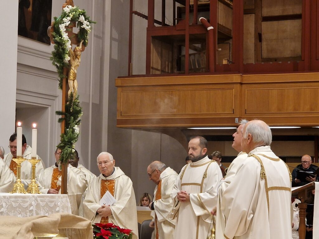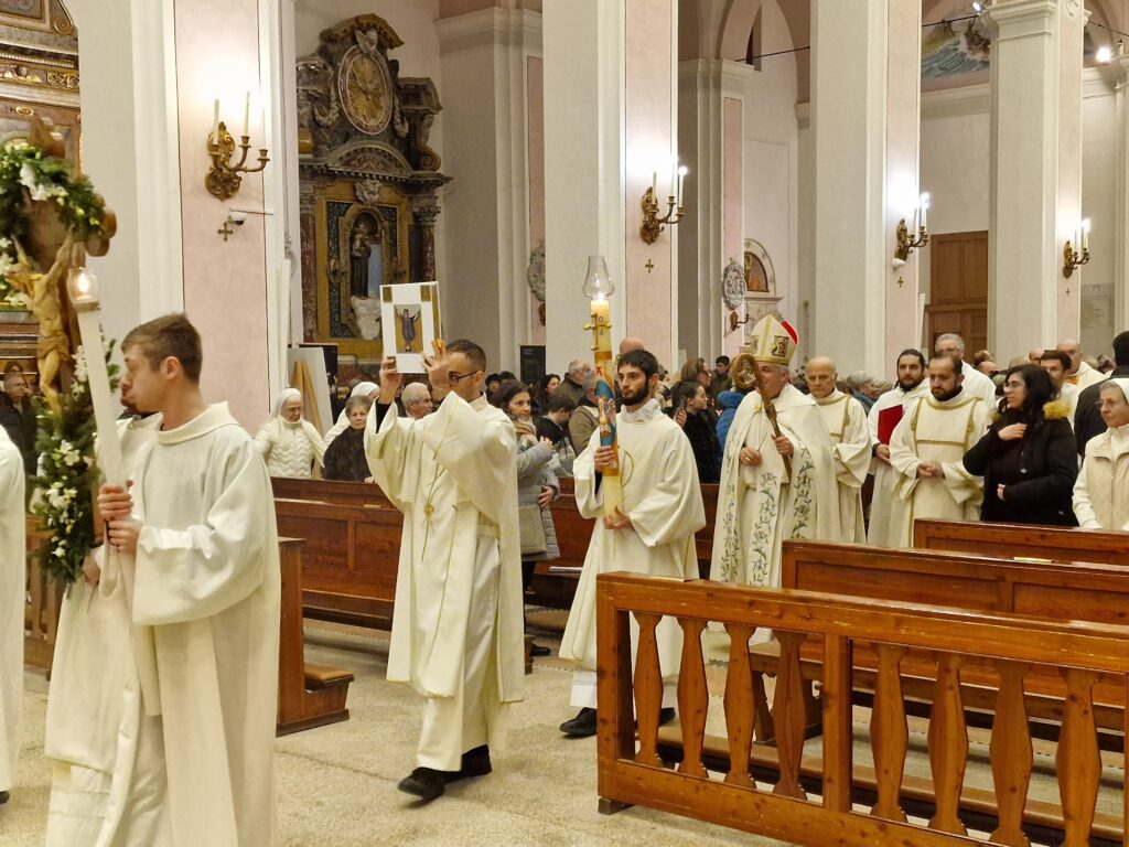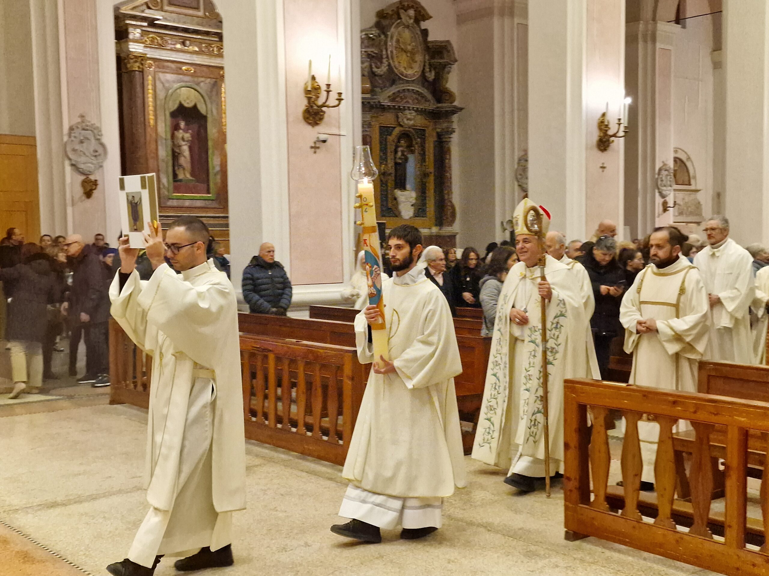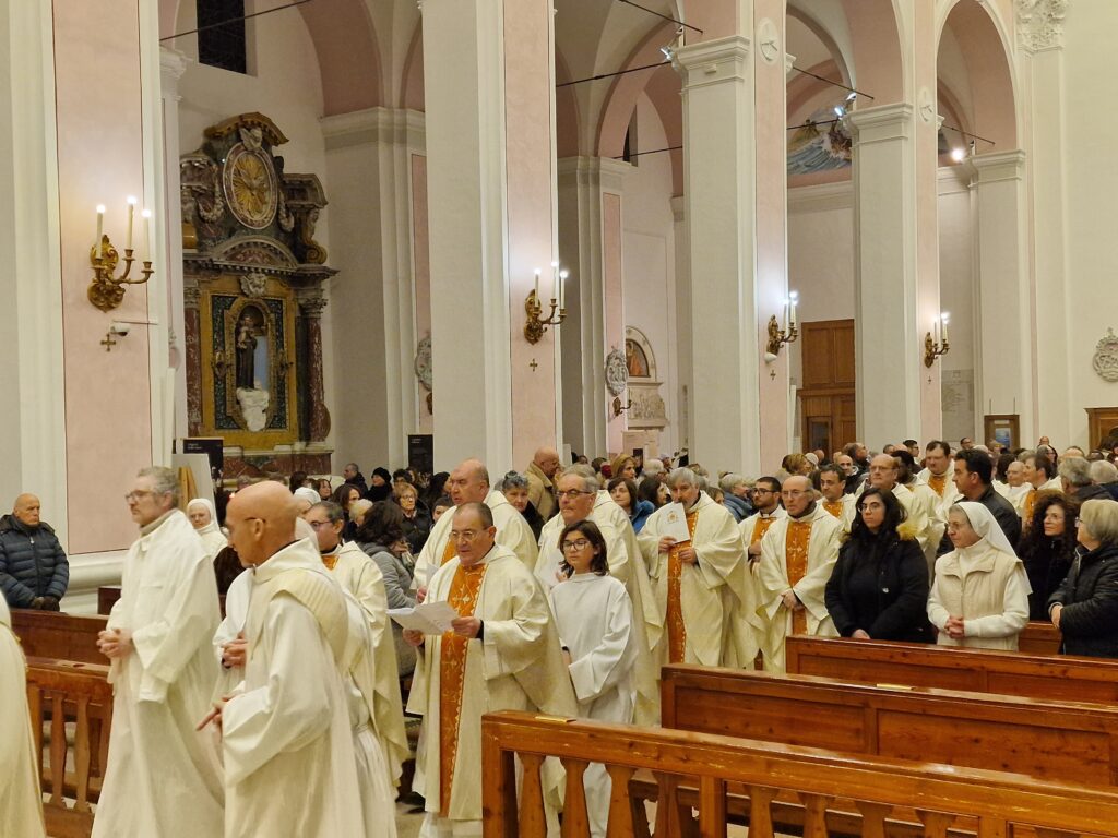All’ingresso in cattedrale, la Corale Giandomenico Stella, diretta dal maestro Massimo Malavolta ed accompagnata all’organo dal M° Elisa Colonnella, ha intonato il canto “Pellegrini di Speranza“, inno del Giubileo 2025. È seguito il terzo momento forte della cerimonia, la Celebrazione Eucaristica, presieduta dal vescovo Gianpiero Palmieri.