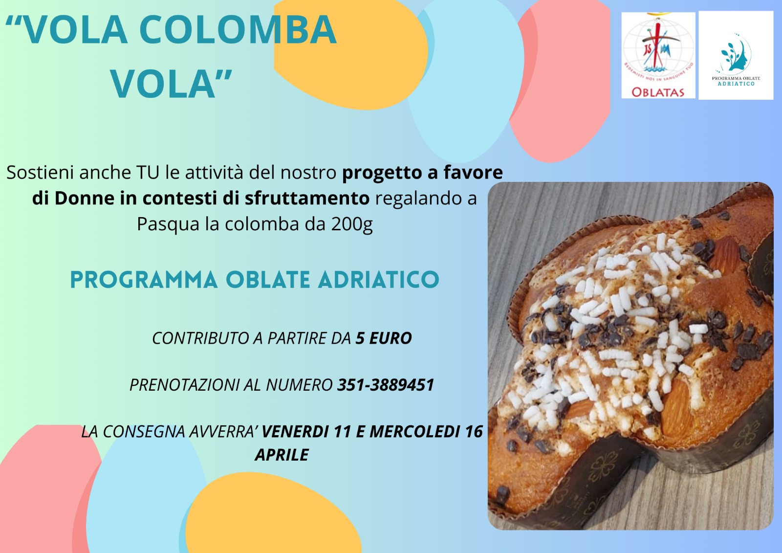 DIOCESI – Un piccolo gesto può fare una grande differenza. Anche quest’anno, in occasione della Pasqua, il Programma Oblate Adriatico lancia l’iniziativa solidale “Vola Colomba Vola”, un progetto volto a sostenere donne in situazioni di sfruttamento, vulnerabilità ed emarginazione, offrendo loro supporto e nuove opportunità.