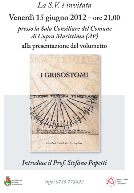 Così si esprime l’autore nella presentazione del volumetto “I Grisostomi”, curato dal Prof. Franco Emidi, che sarà presentato pressola Sala Consiliaredel Comune di Cupra Marittima Venerdì 15 Giugno 2012 alle ore 21,00, con introduzione da parte del Prof. Stefano Papetti.