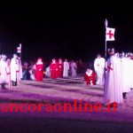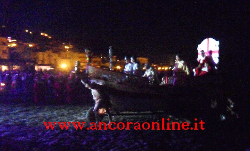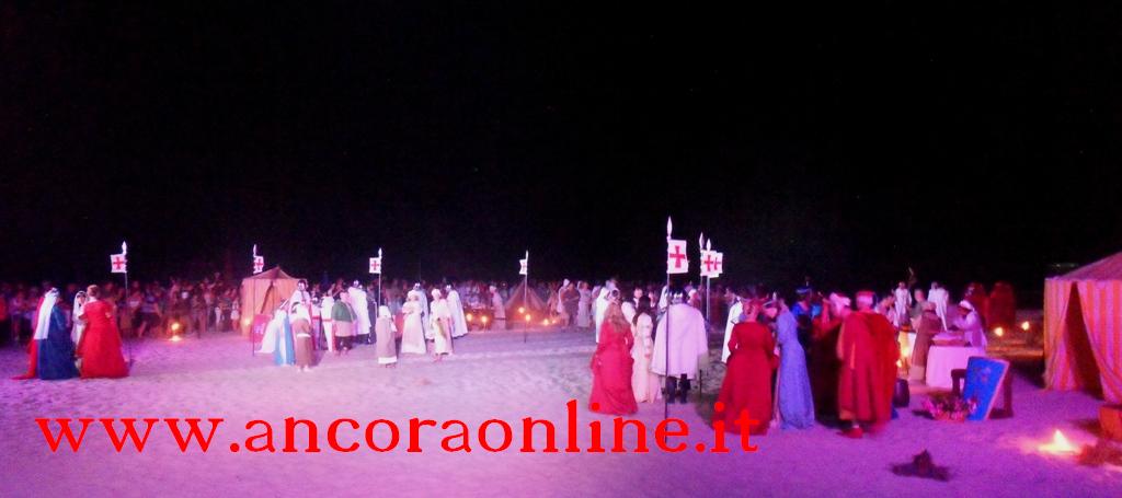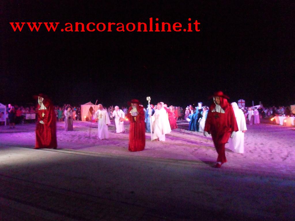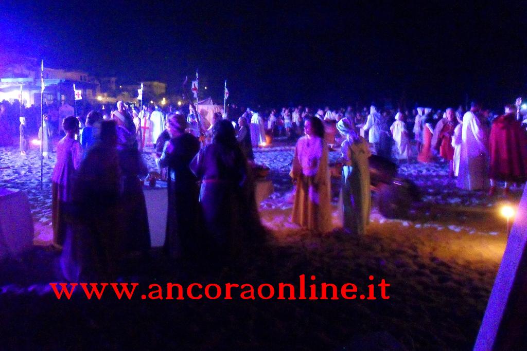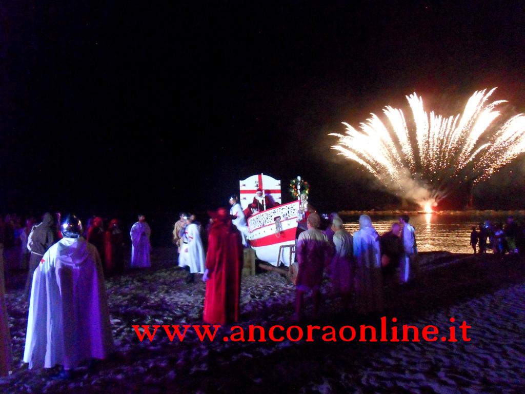 GROTTAMMARE – C’era tanto timore negli organizzatori e nei figuranti che lo “sbarco” non potesse riuscire, essendo il primo anno che si svolgeva. L’assessore Enrico Piergallini ha “colto” l’idea del sindaco Luigi Merli di ideare una rievocazione dello sbarco di Alessandro III così come la narrazione popolare ci ha tramandato, attraversando indenne i secoli. Ad organizzare dal punto di vista tecnico oltre che il Comune, è stato Fabrizio Rosati, già presidente dell’associazione “Presepe vivente ONLUS”, con una trentina di volontari. Hanno recuperato una vecchia barca, l’hanno restaurata e dipinta, organizzando una sincronia con la “Pirotecnica S.Chiara” di Spinetoli (AP) e costruito la grande macchina scenografica. Un finto temporale, una tempesta sul mare, con tanto di  tuoni e fulmini, accompagnati dalla suggestiva colonna sonora dei “Carmina Burana”, hanno  costituito la suggestione dell’arrivo, da una flotta di autentici velieri offerti dalla Lega Navale di San Benedetto del Tronto, dalla quale si è sganciata la scialuppa bianca e rossa di Alessandro III, che ha approdato realmente sul lido notturno di Grottammare, sullo specchio di mare antistante al kursaal, accompagnato da templari e antichi cardinali.