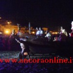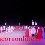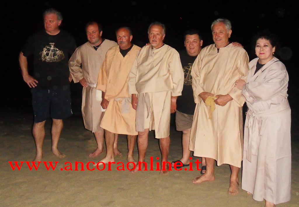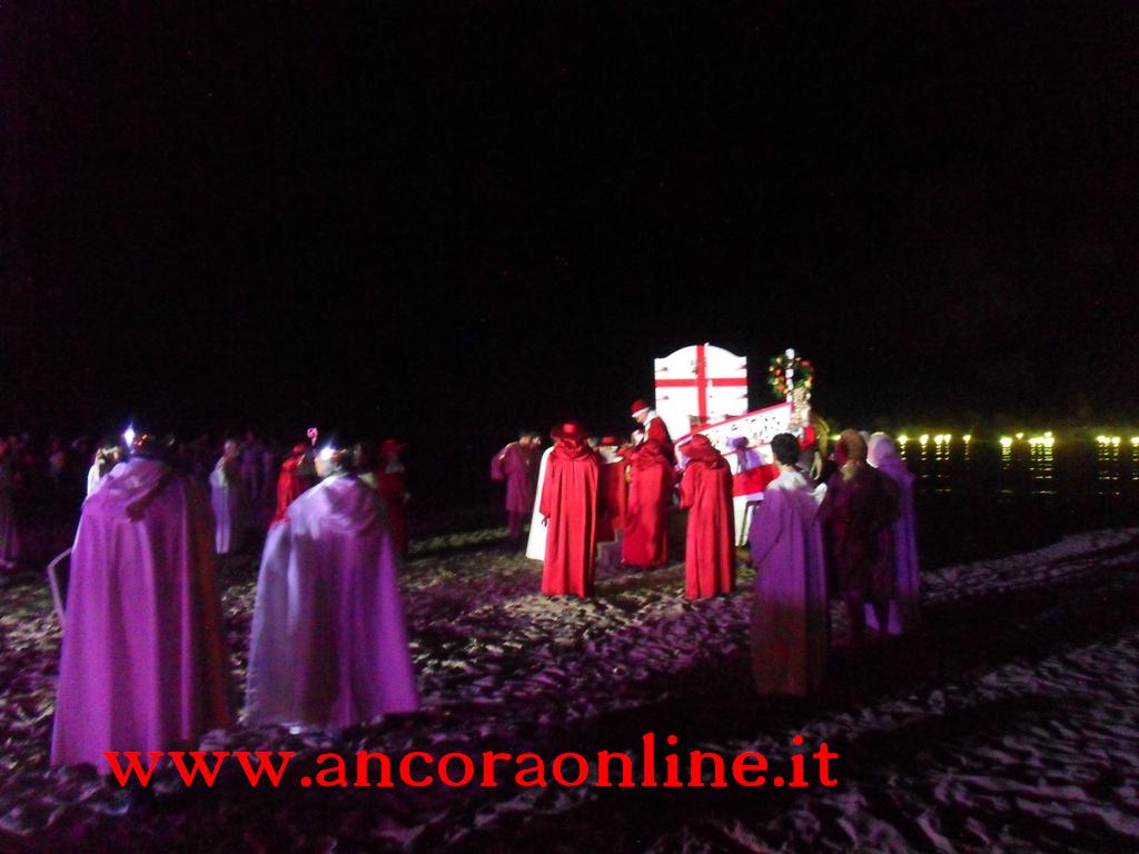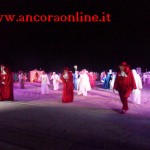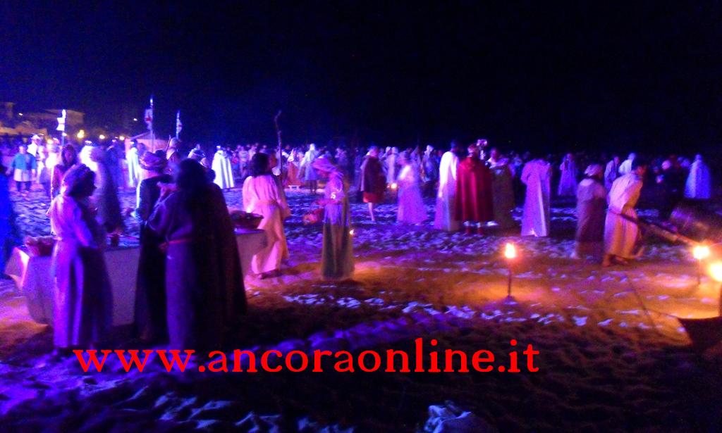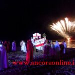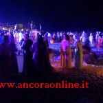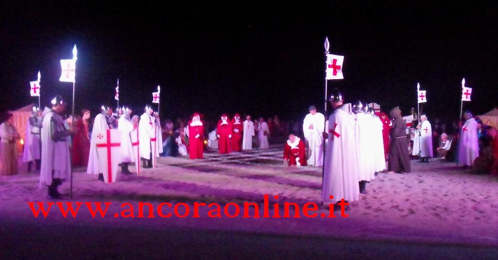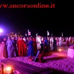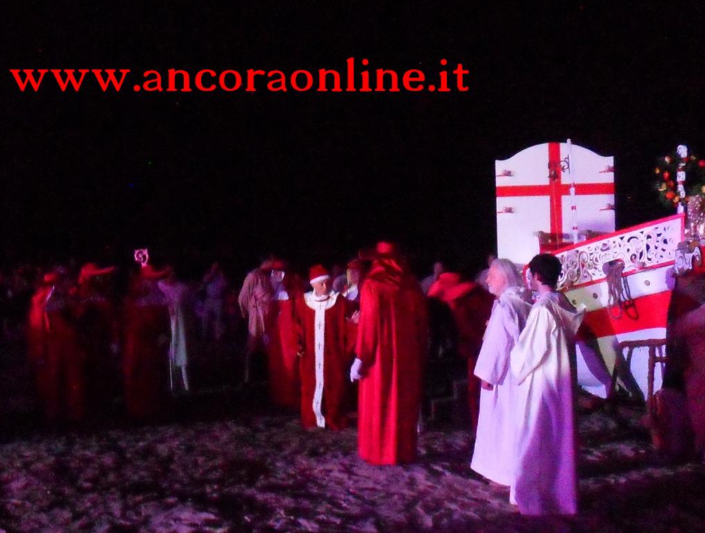 GROTTAMMARE – C’era tanto timore negli organizzatori e nei figuranti che lo “sbarco” non potesse riuscire, essendo il primo anno che si svolgeva. L’assessore Enrico Piergallini ha “colto” l’idea del sindaco Luigi Merli di ideare una rievocazione dello sbarco di Alessandro III così come la narrazione popolare ci ha tramandato, attraversando indenne i secoli. Ad organizzare dal punto di vista tecnico oltre che il Comune, è stato Fabrizio Rosati, già presidente dell’associazione “Presepe vivente ONLUS”, con una trentina di volontari. Hanno recuperato una vecchia barca, l’hanno restaurata e dipinta, organizzando una sincronia con la “Pirotecnica S.Chiara” di Spinetoli (AP) e costruito la grande macchina scenografica. Un finto temporale, una tempesta sul mare, con tanto di  tuoni e fulmini, accompagnati dalla suggestiva colonna sonora dei “Carmina Burana”, hanno  costituito la suggestione dell’arrivo, da una flotta di autentici velieri offerti dalla Lega Navale di San Benedetto del Tronto, dalla quale si è sganciata la scialuppa bianca e rossa di Alessandro III, che ha approdato realmente sul lido notturno di Grottammare, sullo specchio di mare antistante al kursaal, accompagnato da templari e antichi cardinali.
