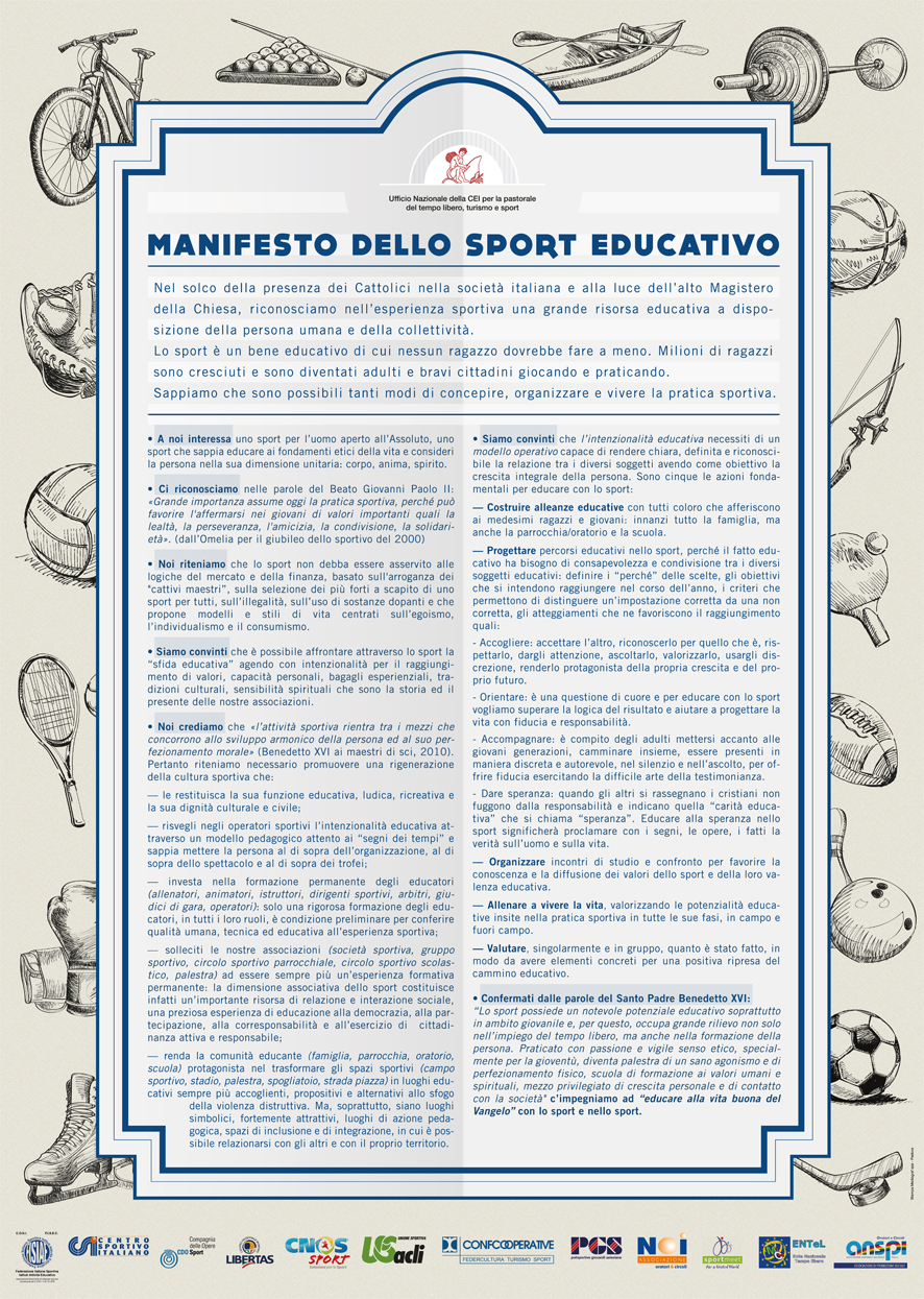 “Nel solco della presenza dei Cattolici nella società italiana e alla luce dell’alto Magistero della Chiesa, riconosciamo nell’esperienza sportiva una grande risorsa educativa a disposizione della persona umana e della collettività. Lo sport è un bene educativo di cui nessun ragazzo dovrebbe fare a meno (Pio XII). Milioni di ragazzi sono cresciuti e sono diventati adulti e bravi cittadini giocando e praticando. Sappiamo che sono possibili tanti modi di concepire, organizzare e vivere la pratica sportiva”.