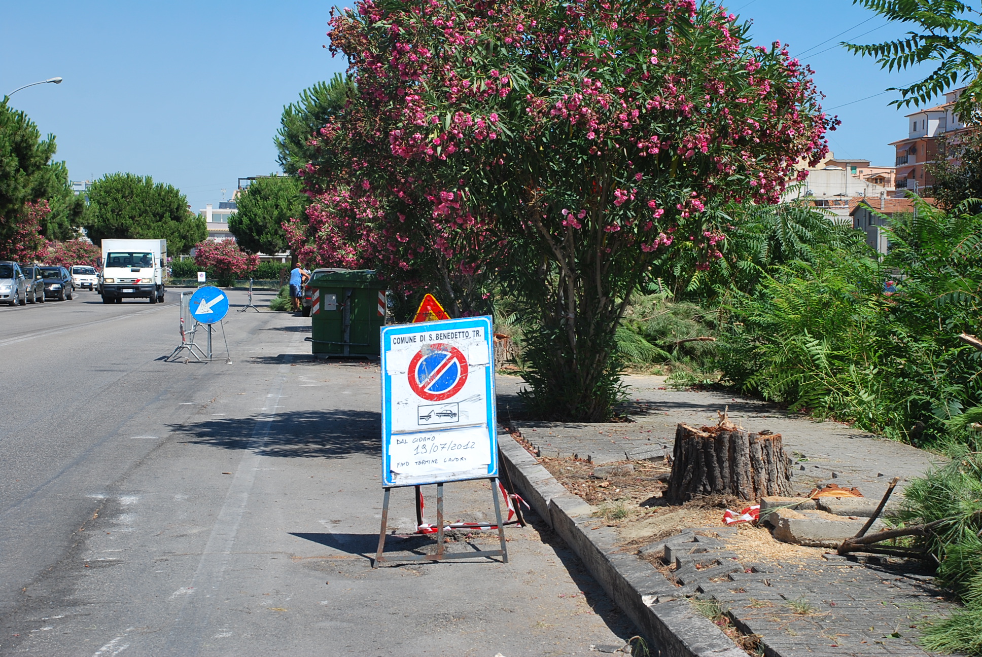 Si tratta di un percorso ciclopedonale che correrà sul lato est per una larghezza minima di 2,50 metri. Per fare spazio alla pista viene allargato il marciapiede e vengono rimosse alcune delle piante che costeggiano il viale. Per l’esattezza, sono stati eliminati 8 pini che occupavano la larghezza del percorso e che saranno sostituiti da altre essenze arboree meno invasive da collocare in apposite “anse” create lungo il percorso. Come impone la legge, gli alberi da piantare saranno il doppio di quelli tolti: altre essenze arboree saranno dunque collocate in altre zone della città da individuare. Non saranno invece toccate le palme che caratterizzano il viale. E’ prevista l’erezione di una staccionata a delimitare la pista dai terreni adiacenti che si trovano ad una quota inferiore. I lavori, progettati dai tecnici comunali Angelo Amabili e Romeo Capriotti, sono eseguiti dalla ditta S. Francesco Scavi ed hanno un valore di 63 mila euro. La loro ultimazione è prevista entro la metà di settembre.