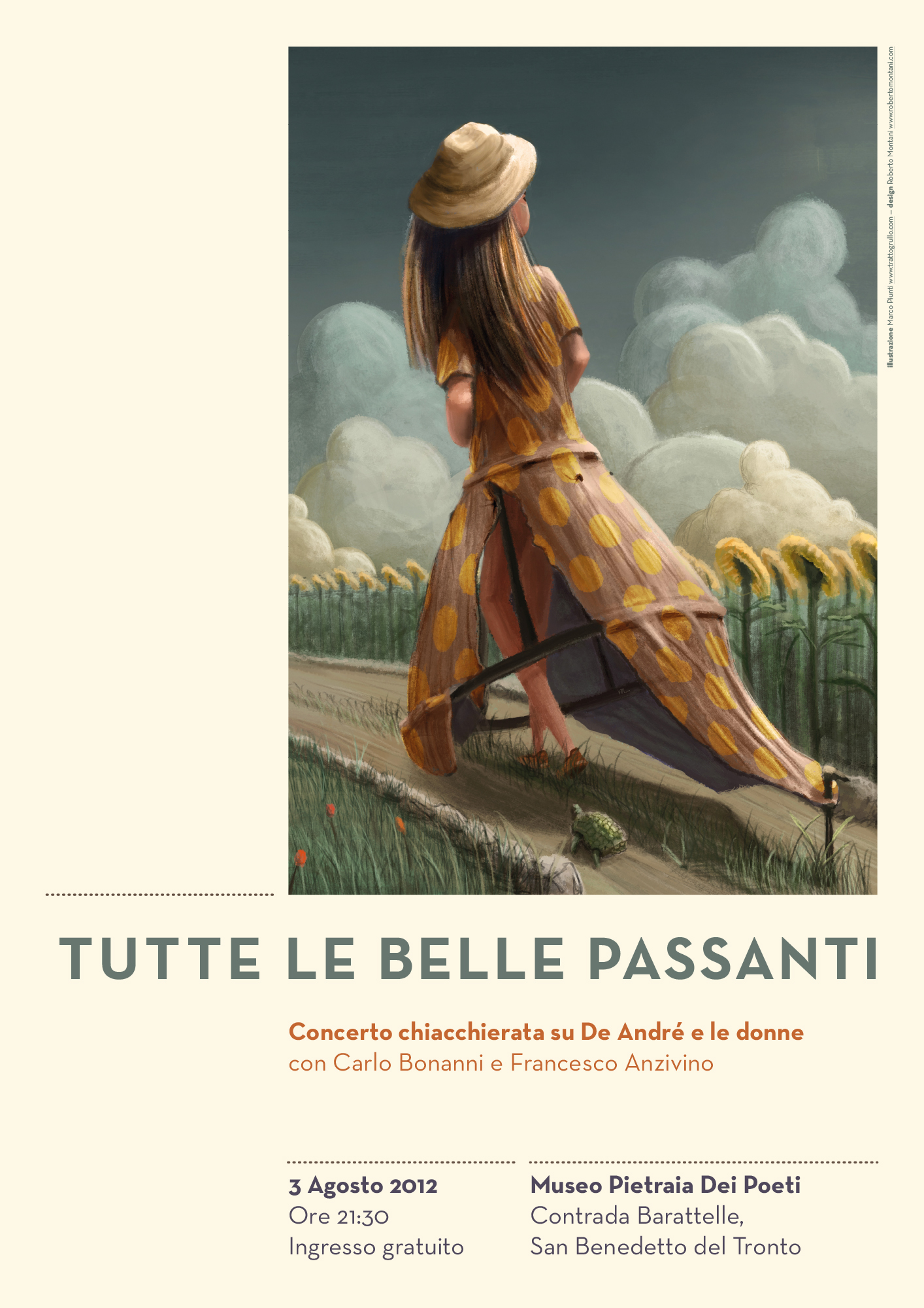 Seguirà alle 21.30 il concerto chiacchierata Tutte le belle Passanti, in cui Carlo Bonanni, fondatore, voce e chitarra del tributo Carodeandré, e Francesco Anzivino, accompagnati da Enrico Corinti (voce narrante), Domenico Berni (contrabbasso), Vincenzo Capriotti (piano) e Daniele Schiavi (chitarra), attraverseranno il canzoniere di Fabrizio De André per ridare vita alle donne protagoniste delle parole e delle note del cantautore genovese.