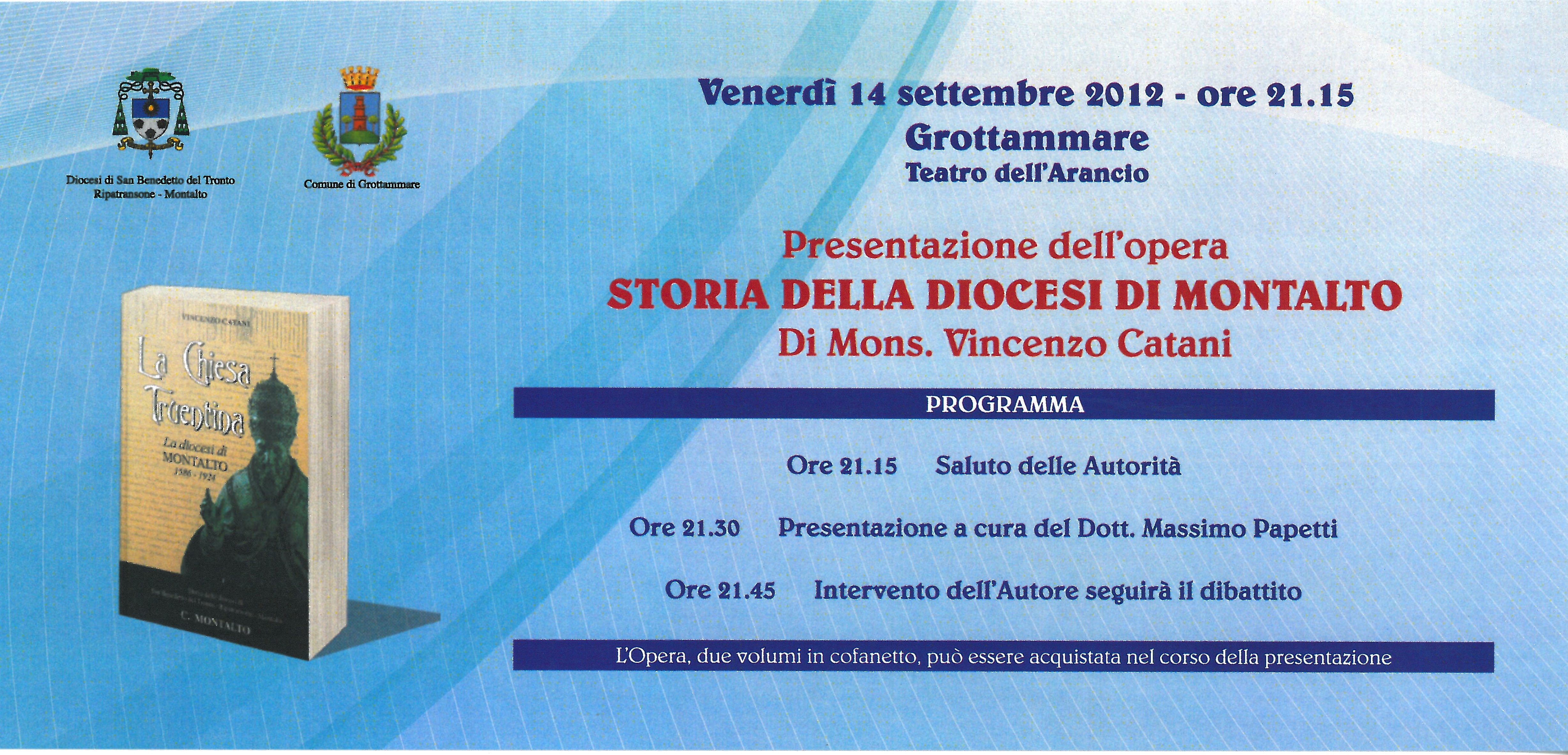 Don Vincenzo Catani presenterà venerdì 14 settembre 2012 alle ore 21.15 presso il Teatro dell’Arancio di Grottammare l’opera “Storia della Diocesi di Montalto”