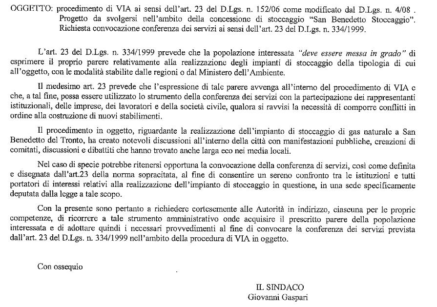 Vi alleghiamo sia la domanda presentata dal Comune di San benedetto del Tronto, sia la risposta del ministero così da darvi un informazione completa.
