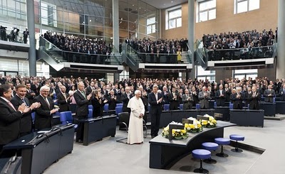 Ha preso poi la parola il Prof. Emanuele Bilotti dell’Università Europea di Roma che ha commentato il discorso del Papa pronunciato davanti ai membri del parlamento tedesco. L’intervento, di taglio prevalentemente giuridico, si è soffermato sul fondamento della sovranità dello stato. Il professore, prendendo spunto dalle parole del Pontefice, si è domandato se la sovranità sia solo un rapporto di forze fra chi detiene il potere e il popolo e se la legge sia frutto del puro arbitrio dei governanti. La cultura giuridica moderna, ha proseguito, ha voluto porre il proprio fondamento nella “volontà generale” sancendo il principio “auctoritas, non veritas fecit legem”. La soluzione alternativa a quella proposta dal positivismo è quella invece che affonda le sue radici nella legge naturale. Questa idea, di chiara matrice cristiana, ha prevalso in tutte le costituzioni emanate dopo la guerra in risposta ai totalitarismi. Negli ultimi decenni la situazione è di nuovo cambiata perché i poteri della tecnica e del mercato hanno prevalso sulla visione umanistica espressa dalle costituzioni “post belliche”. Si è voluto asserire inoltre che la ragione non è capace di cogliere il bene e, di conseguenza, di emanare leggi improntate alla giustizia: ha prevalso l’atteggiamento di Pilato che di fronte alla domanda sulla verità ha dato una risposta di stampo pragmatico, che però ha finito per condannare un innocente. Il docente ha dunque auspicato un ritorno alla fiducia nella ragione e ha ricordato come il Pontefice abbia indicato come modello ai politici tedeschi l’episodio biblico nel quale Salomone chiede a Dio il dono della saggezza, preferendolo agli onori e alle ricchezze e si è chiesto provocatoriamente se oggi i politici sarebbero in grado di domandare la stessa cosa al Signore