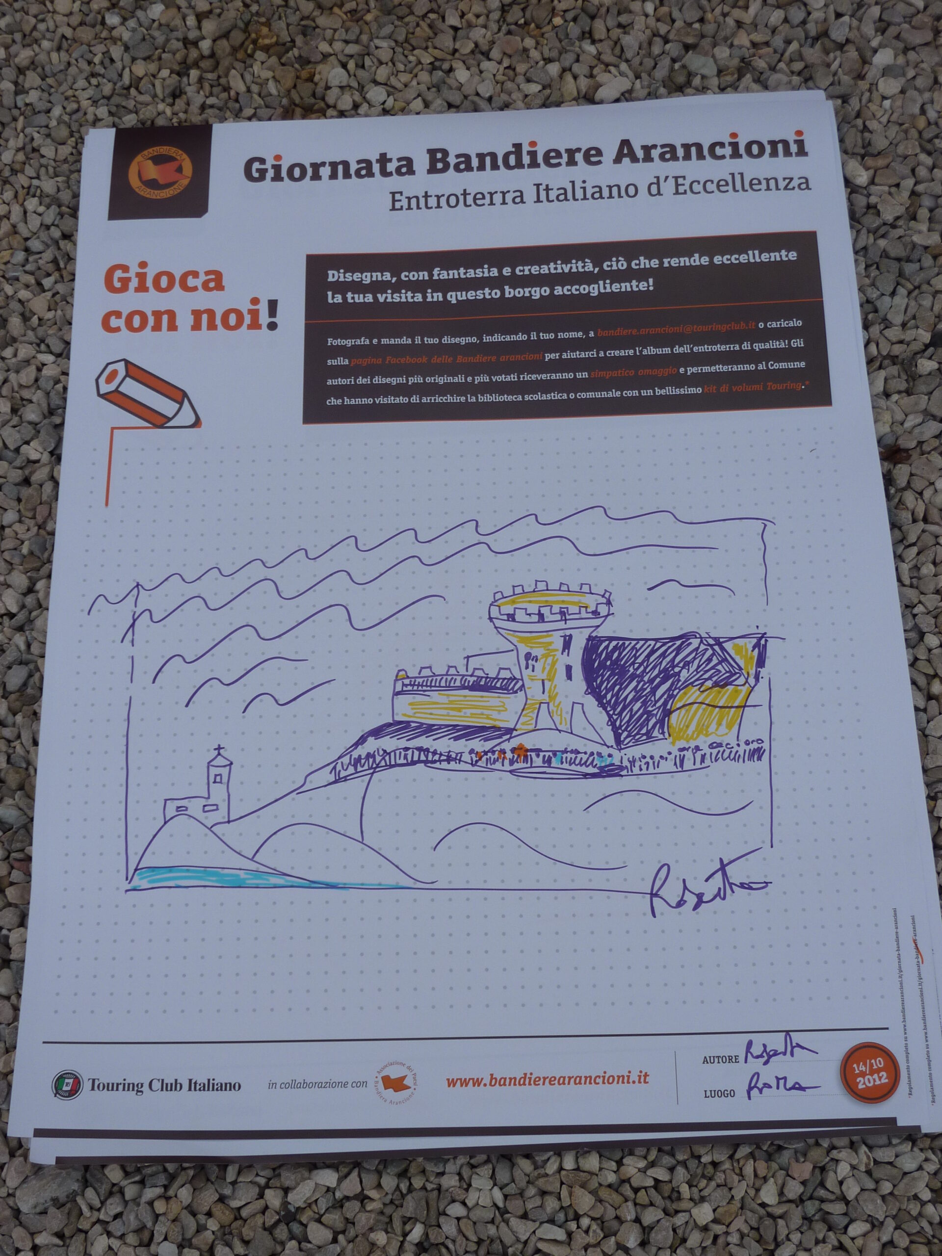 In tale sede si è anche svolto il gioco proposto dalla stessa Bandiera Arancione, che ha fornito pennarelli e fogli, tramite i quali il turista aveva la possibilità di disegnare, con fantasia e creatività, ciò che più lo aveva colpito o ciò che secondo lui rende eccellente il borgo appena visitato. Ogni disegno è stato poi fotografato ed inviato al T.C.I., che valuterà tutte le foto pervenute – sulla base dell’originalità – e sceglierà i 10 migliori disegni, che permetteranno al Comune visitato di ricevere un prestigioso kit di volumi Touring per arricchire la biblioteca comunale e all’autore del disegno di ricevere un simpatico omaggio T.C.I.