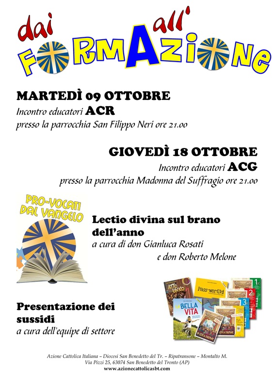 La serata presenterà un momento dedicato all’ esposizione dell’icona biblica del nuovo anno associativo (dal Vangelo di Luca 9,10-17) a cura dell’assistente diocesano del settore giovani, Don Roberto. A questo seguirà la presentazione dei testi ACG, con particolare attenzione alle tematiche e agli obiettivi da raggiungere durante il cammino con i giovanissimi/giovani. Sarà anche l’occasione per annunciare le date di alcuni eventi associativi a livello diocesano.