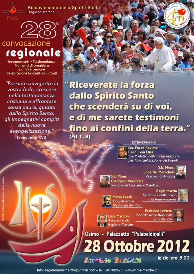 La Convocazione, il cui tema è “Riceverete la forza dallo Spirito Santo che scenderà su di voi, e di me sarete testimoni fino ai confini della terra” (At 1,8), vedrà la partecipazione di numerosi ospiti: S.E. Card. Ivan Dias, S.E. Mons. Edoardo Menichelli, S.E. Mons. Giancarlo Vecerrica, Ralph Martin (testimone delle origini del Rinnovamento Carismatico), Mario Landi (coordinatore nazionale), Federico Luzietti (coordinatore regionale), Luca Marconi (assessore alla regione Marche per la famiglia e i servizi sociali). La partecipazione alla giornata per tutti i fratelli che accetteranno l’ invito è ovviamente gratuita e il Rinnovamento diocesano organizzerà diversi pullman per poter facilmente raggiungere Osimo. Ulteriori informazioni possono essere chieste ad uno qualsiasi dei 13 gruppi RnS sparsi in tutta la diocesi, ai vostri parroci, direttamente al Coordinatore Diocesano Luigi Mattioli ( luigi.mattioli@teletu.it ), o anche semplicemente scrivendoci sulla nostra pagina Facebook RnS – Diocesi di San Benedetto del Tronto.