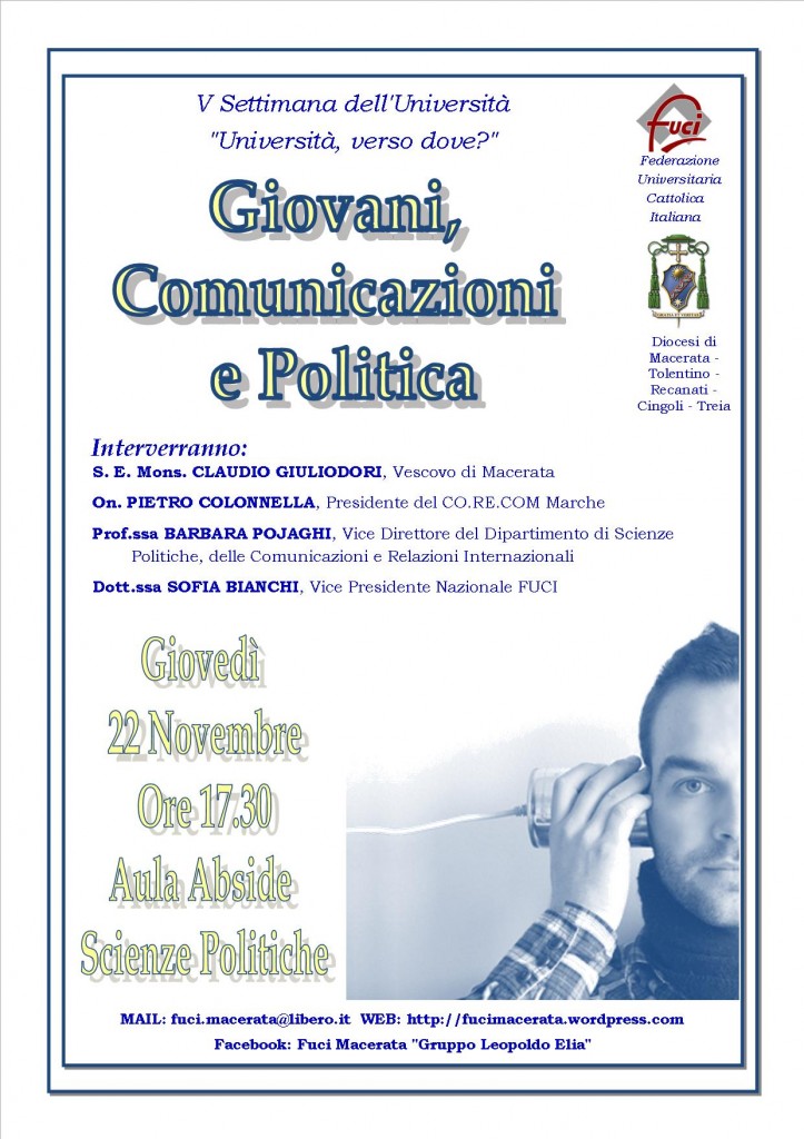 MACERATA– Tutto pronto all’evento organizzato dai ragazzi della FUCI (federazione universitaria cattolica italiana) che si terrà giovedì 22 novembre dalle ore 17:30, presso il Dipartimento di Scienze Politiche, delle Comunicazioni e delle Relazioni internazionali, dal titolo: “Giovani, comunicazioni e politica”