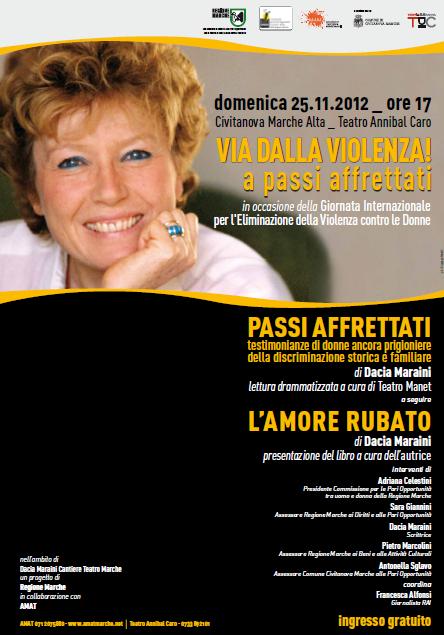 “Via dalla violenza! A passi affrettati” – l’iniziativa organizzata con Dacia Maraini – anche grazie al lavoro di Stefania Benatti – si terrà domenica 25 novembre alle 17 presso il Teatro Annibal Caro di Civitanova Marche Alta.