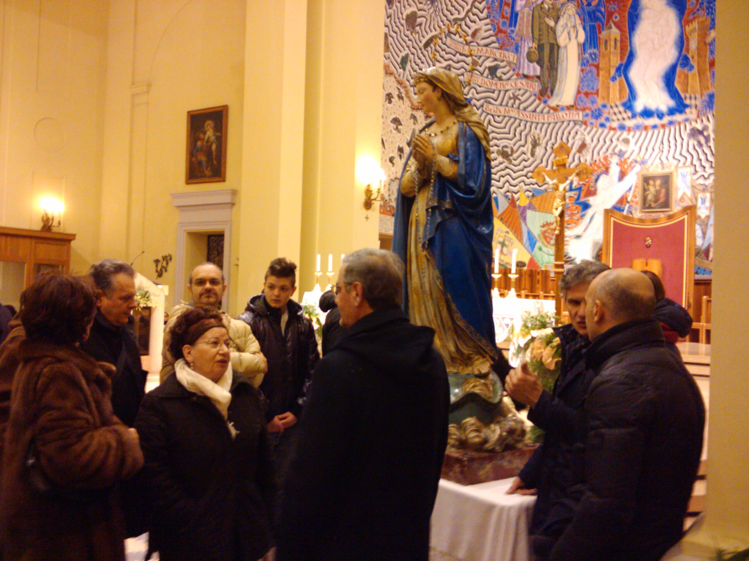SAN BENEDETTO DEL TRONTO – Si è tenuta all’interno della Cattedrale di Santa Maria della Marina la processione che conclude la novena dell’Immacolata, celebrata dalla città di San Benedetto del Tronto in segno di gratitudine verso l’Immacolata Concezione, che nel 1855 salvò la città da un’epidemia di colera. Dopo la S. Messa celebrata dal nostro Vescovo Gervasio Gestori, la pioggia troppo forte ha impedito che la statua in cartapesta, anch’essa realizzata in seguito al voto fatto dalle autorità comunali, fosse portata in processione per le vie della città, gesto che fino ad oggi era stato ripetuto ogni anno. Successivamente alla processione è stato rinnovato il voto all’Immacolata, con l’accensione da parte del sindaco Giovanni Gaspari del cero votivo di fronte alla statua.