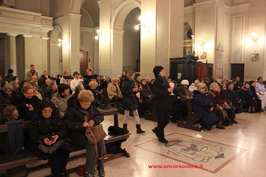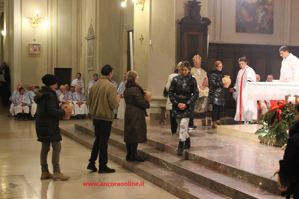 Durante l’offertorio sono stati offerti al Vescovo gli otri di olio che serviranno a tenere accesa la lampada per la cappella che custodisce la riproduzione della Santa Casa presso la Basilica di Ripatransne.