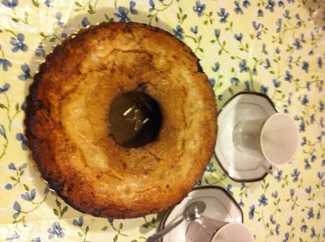 In una capace ciotola versare la farina, il lievito, lo zucchero e alla fine le uova e l’olio/burro, impastare con il cucchiaio di legno fino ad ottenere un impasto colloso e abbastanza sodo. In un’altra terrina, dolcificare la ricotta con lo zucchero e una spruzzatina di Mistrà. Imburrare scrupolosamente uno stampo in alluminio per il ciambellone, versarvi metà dell’impasto di farina. Con un cucchiaio, disporvi sopra uno strato di ricotta, poi ricoprire con il restante impasto di farina. Infornare in forno già caldo a 180° circa ( dipende dal tipo di forno, regolatevi, se è a gas, deve andare più piano, se è ventilato o elettrico, più forte ecc.) per circa mezz’ora. Non aprire lo sportello se non quando il ciambellone diventi dorato e come “abbronzato” sulla superficie. Lasciar raffreddare, poi aiutandosi con un coperchio largo e con un vassoio per torta, capovolgerlo e…il gioco è fatto! E’ buonissimo, è un antico ciambellone con un morbido e profumato cuore di ricotta. Volendo, si può grattugiare la buccia di un limone al momento dell’impasto. Buon appetito.