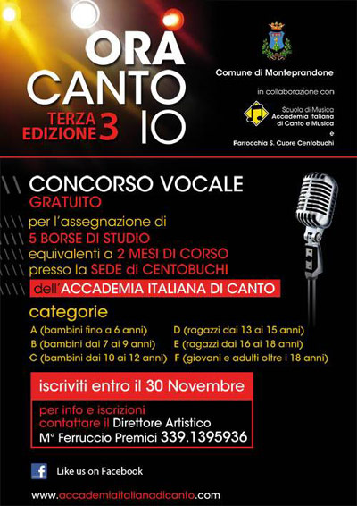 I finalisti si esibiranno di fronte a un pubblico numeroso e saranno stati giudicati da una Commissione istituita ad hoc. In palio per i vincitori 5 borse di studio equivalenti ognuna a 2 mesi di corso gratuito presso la Sede dell’Accademia Italiana di Canto a Centobuchi.