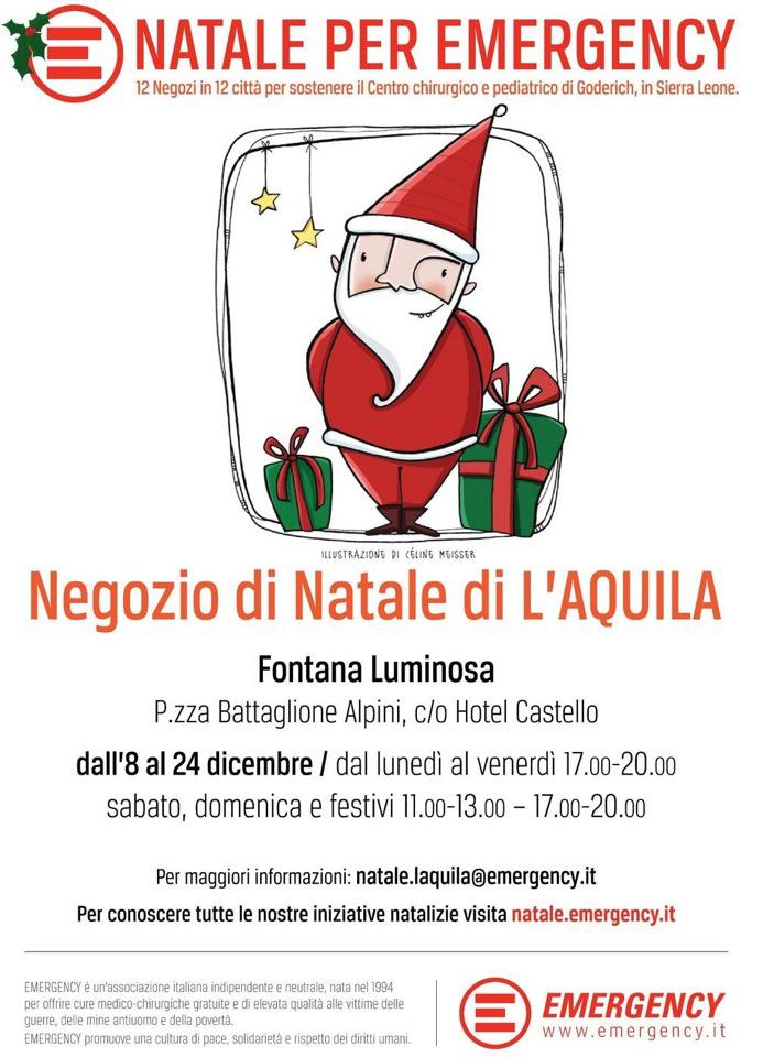 L’Aquila – Dall’8 al 24 dicembre, presso la Fontana Luminosa de L’Aquila, avranno luogo i mercatini di Natale di Emergency. Dove per ‘mercatini’ s’intendono veri e propri negozi, all’interno dei quali saranno in vendita oggetti proveniente dai Paesi in cui Emergency opera, e altri prodotti offerti dalle aziende che hanno deciso di contribuire con l’impegno umanitario dell’associazione. Il ricavato dell’iniziativa sarà devoluto a sostegno del Centro chirurgico e pediatrico di Emergency a Goderich, in Sierra Leone. Gli orari di apertura al pubblico del mercatino vanno dal lunedì al venerdì dalle 17:00 alle 20:00; sabato, domenica e festivi dalle 11:00 alle 13:00 e dalle 17:00 alle 20:00. Per maggiori informazioni: natale.laquila@emergency.it o visitate il sito natale.emergency.it.
