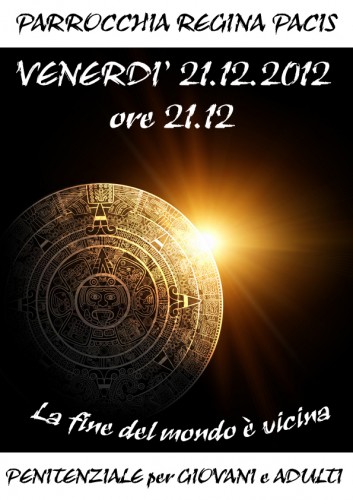 MONTEPRANDONE – Ecco la simpatica locandina della liturgia penitenziale che si terrà proprio il fatidico ormai 21 dicembre nella Parrocchia di Regina Pacis a Centobuchi, alle ore 21.12! anche se ci sorge una domanda, ma a che ora è la fine del mondo, come cantava Ligabue, qualche anno fa. No perché se è allo scoccare della mezzanotte del 21, siamo in ritardo anche per i pentimenti, se invece è alla fine della giornata allora giusto in tempo!