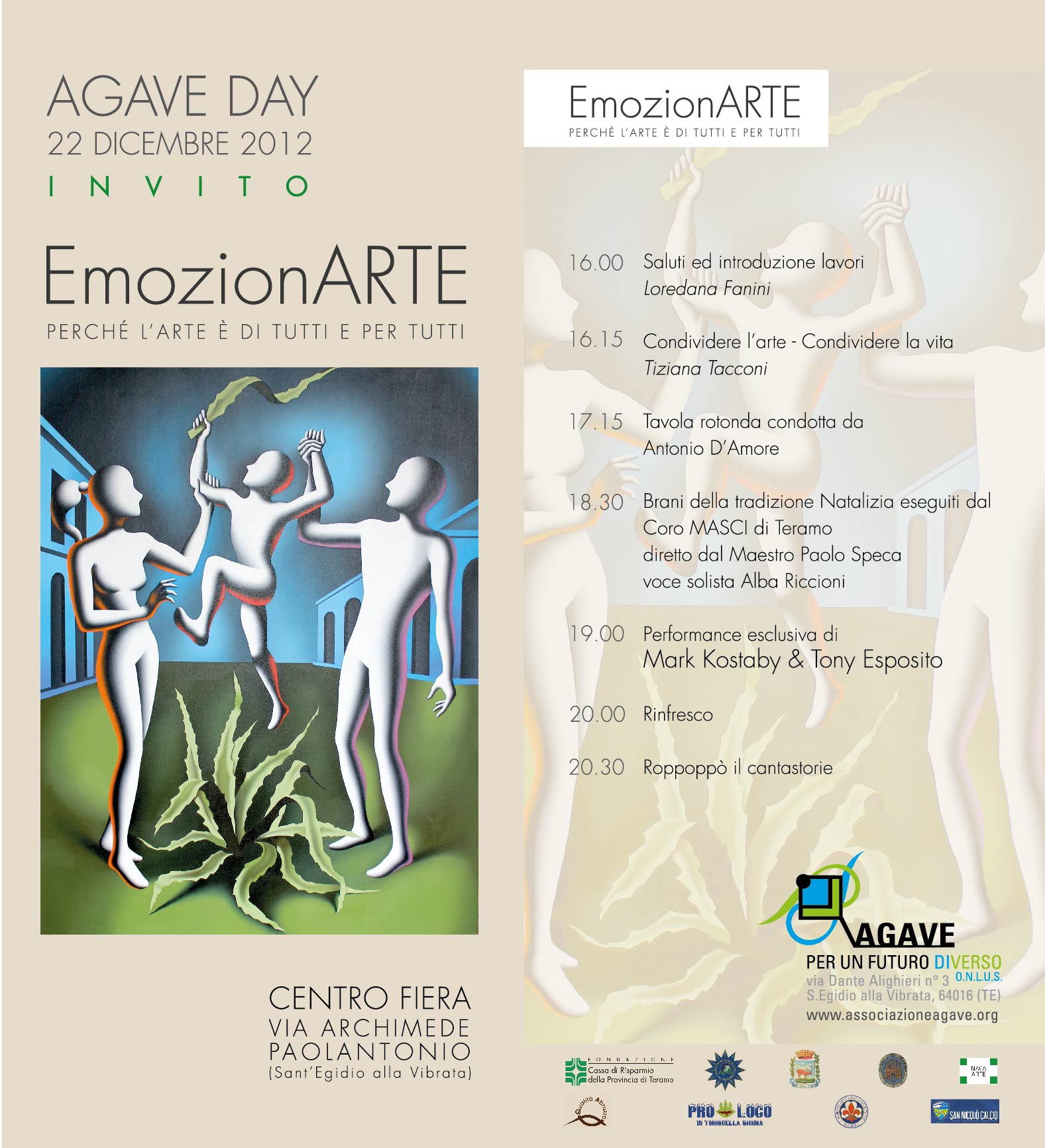 Interverranno Tony Esposito e il noto pittore americano Mark Kostaby, che per l’occasione donerà una sua tela all’Associazione, che da cinque anni si batte per l’integrazione dei diversamente abili nel nostro territorio. Nel corso della serata saranno distribuite serigrafie firmate dal pittore, per la raccolta fondi da destinare ai porgetti dell’Agave.