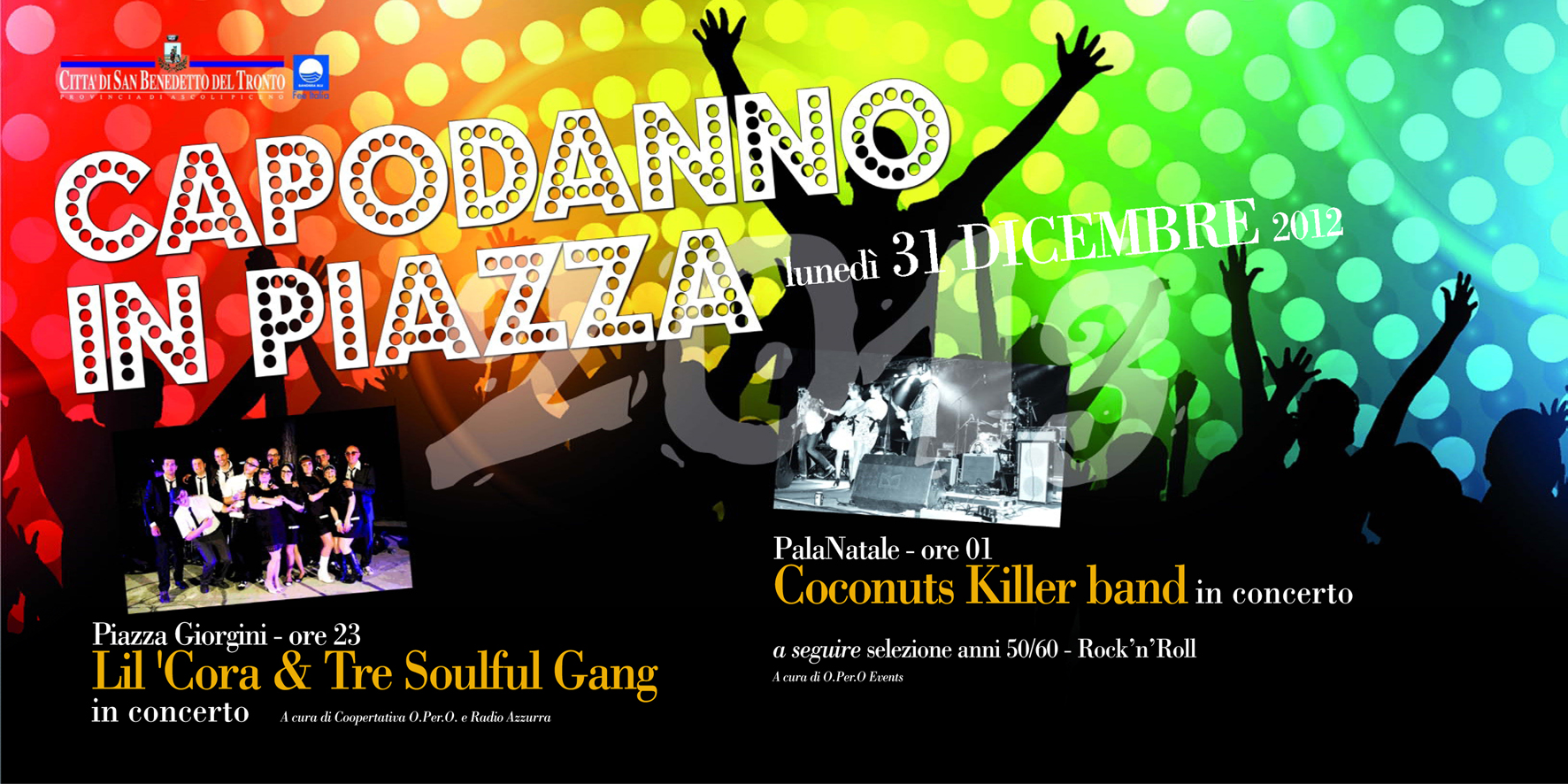 SAN BENEDETTO DEL TRONTO- San Benedetto del Tronto si prepara per la notte di San Silvestro con due concerti gratuiti organizzati dalla cooperativa O.per.O con il contributo dall’Amministrazione comunale. Il 31 dicembre sarà una lunga notte caratterizzata da musica anni ’50 e ’60. Si partirà alle 23 con il concerto in piazza Giorgini. Ad esibirsi il gruppo “Lil’ Cora & the Soulful Gang”: dodici elementi che coinvolgeranno gli spettatori al ritmo soul anni ’60. L’animazione della serata è a cura di Radio Azzurra.