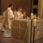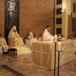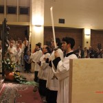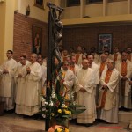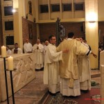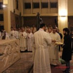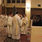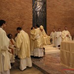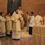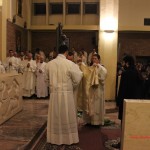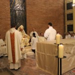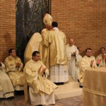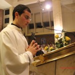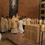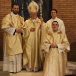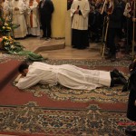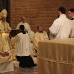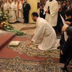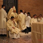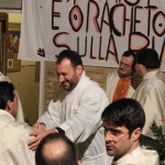 Consacrato diacono è esplosa la gioia nel volto di Matteo rivestito degli abiti diaconali che sono la stola e la dalmatica, dopo la lunga e intensa invocazione dei santi e beati mentre prostato a terra e dopo l’imposizione delle mani del vescovo Gervasio.