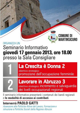 MARTINSICURO – Proseguono con successo i seminari informativi sui progetti “La crescita è donna 2” e “Lavorare in Abruzzo 3”. Dopo Sulmona, Roseto degli Abruzzi e Teramo, Castelnuovo Vomano e Pescara, giovedì 17 gennaio sarà la volta di Martinsicuro.