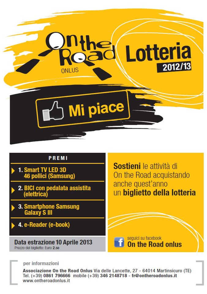 MARTINSICURO – Torna la lotteria di On the Road. Anche quest’anno sono in vendita i biglietti del concorso a premi “Se ti piace, ci sostieni!”, indetto e promosso dalla Onlus On the Road.