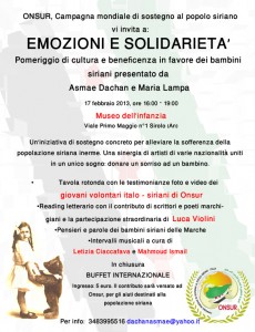 L’ONSUR, Campagna mondiale di sostegno al popolo siriano ha organizzato presso il Museo dell’infanzia di Sirolo (AN) un pomeriggio di cultura e solidarietà, Domenica 17 Febbraio 2013 dalle ore 16:00 alle 19:00.