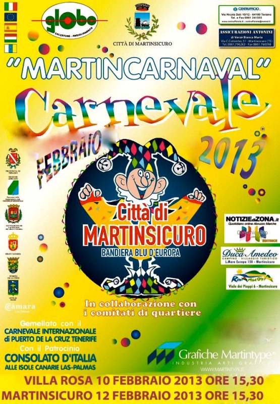MARTINSICURO – L’Associazione “Martin Carnaval”, con il patrocinio del comune di Martinsicuro e la collaborazione dei comitati di quartiere, organizza la 12° edizione del Carnevale 2013. L’evento è gemellato con il Carnevale Internazionale di Puerto de La Cruz (Tenerife), con il patrocinio del Consolato Italiano delle Isole Canarie a Las Palmas.