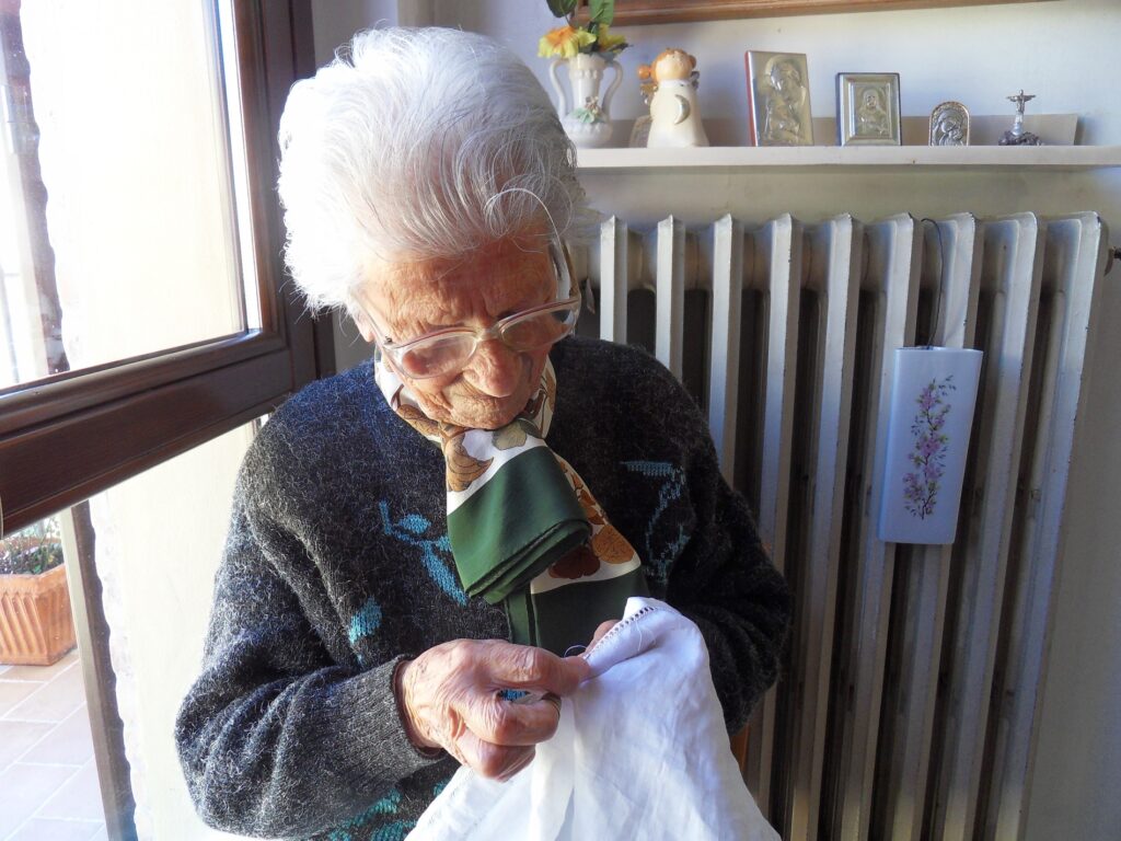 Noto sulla sedia tutto l’occorrente per il ricamo e con grande stupore chiedo chi ci si stesse dedicando, lei tutta cordiale mi risponde che stava ultimando un lavoretto, quindi non potevo non proporle di farmi scattare una foto mentre lei lo lavorava.