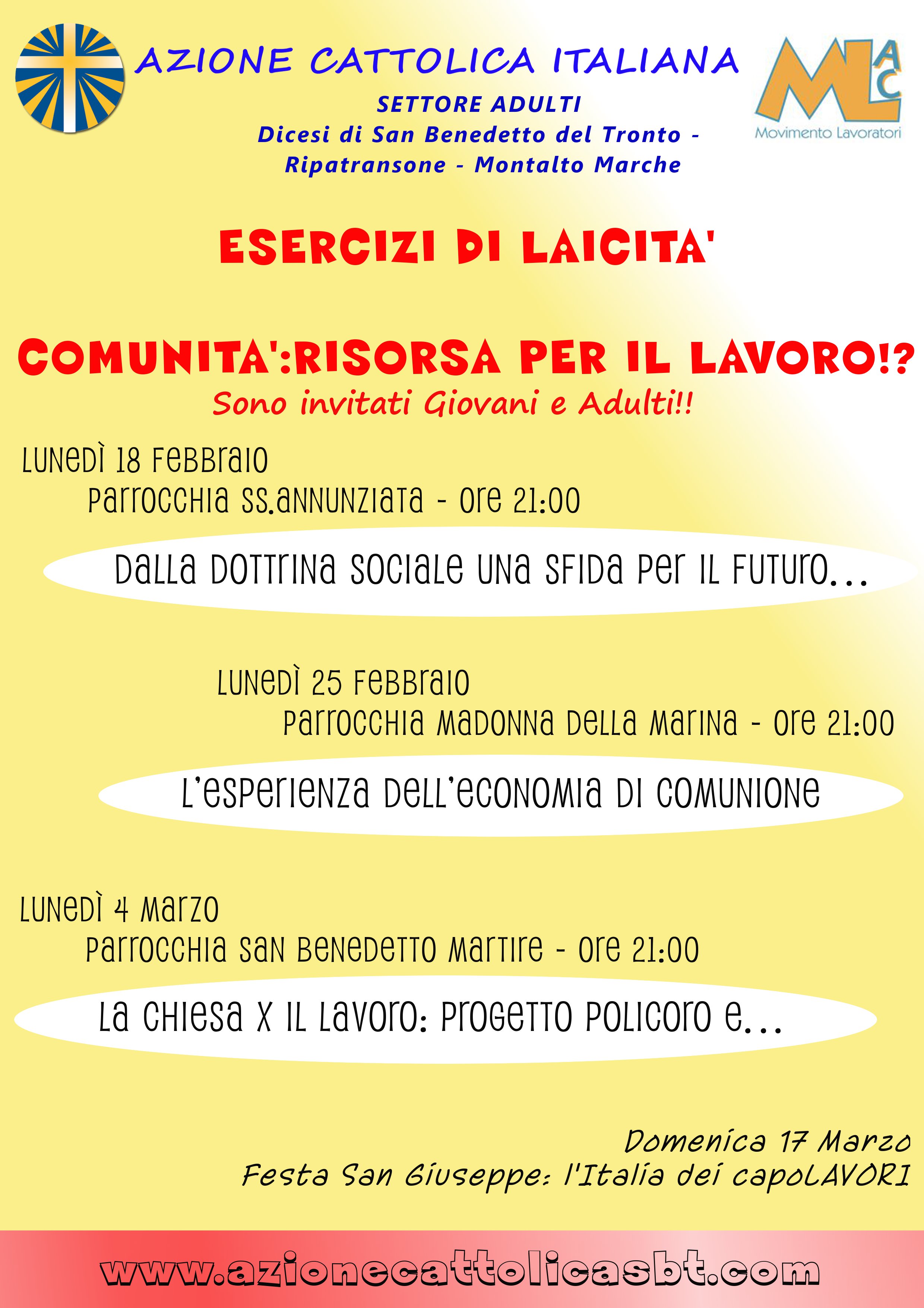DIOCESI – Il settore adulti di Azione Cattolica promuove un percorso di tre incontri che mettono a tema “la comunità: risorsa per il lavoro?!”, nei tre lunedì di quaresima a partire dal 18 febbraio, per concludere con la festa di S. Giuseppe il 17 marzo; una giornata insieme per riflettere sulla comunità partendo dall’impresa marinara e il suo legame con la comunità ecclesiale e civile locale.