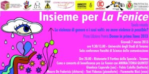 PROVINCIA – La Commissione Pari Opportunità della Provincia di Teramo, nella persona della presidente Desireè Del Giovine e della vicepresidente Zaira Raiola, con il contributo della Consigliera di Parità Anna Pompili e dell’Università di Teramo, nonché della presidente CPO di ateneo Fiammetta Ricci, organizza, per la giornata di Giovedì 7 Marzo, la manifestazione Insieme per la Fenice, contro la chiusura del Centro Antiviolenza “La Fenice”.