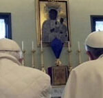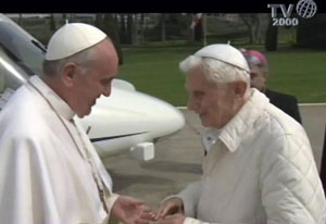 Immagini nella storia. Il Ctv ha, quindi, diffuso alcune immagini significative dell’incontro tra Francesco e Benedetto XVI. La prima è quella dell’elicottero che atterra. Papa Bergoglio scende e si avvia a passo svelto verso Papa Ratzinger che appoggiato a un bastone a sua volta gli va incontro. L’abbraccio caloroso, poi i volti sorridenti mentre si scambiano qualche parola, mani nelle mani, occhi negli occhi. La seconda riprende Francesco, avanti, e Benedetto XVI, più lentamente, appoggiato al bastone, che si avviano verso la cappella papale. Papa Ratzinger offre al suo successore il posto all’inginocchiatoio d’onore, ma quest’ultimo, dicendogli “No, siamo fratelli”, ha voluto che si inginocchiassero insieme nello stesso banco, a pregare. Non è difficile immaginare che quell’immagine dei due Papi, vestiti di bianco, Benedetto XVI ancora con la giacca a vento bianca sulla talare, inginocchiati, le spalle ricurve, che pregano, entrerà nella storia. La terza immagine: Francesco dona a Benedetto XVI un’icona della Madonna dell’Umiltà. “Dell’umiltà, bella”, dice Ratzinger. A proposito dell’umiltà, “mi permetta di dirle una cosa – afferma Bergoglio -. Ho subito pensato a lei e gliel’ho voluta portare in dono: ci ha dato tanti esempi di umiltà nel suo pontificato. Davvero la tenerezza”. “Non dimentichiamola”, ha esortato, Benedetto XVI, che, commosso, più volte ha ripetuto “grazie”, stringendo forte le mani di Francesco. Infine, c’è l’immagine dell’inizio del colloquio tra i due nella biblioteca. Nel pomeriggio, dopo il pranzo e una passeggiata nei giardini, come ama fare di solito Benedetto XVI, Papa Francesco, accompagnato dal suo predecessore, ha raggiunto in auto l’eliporto delle Ville pontificie di Castel Gandolfo. L’elicottero è partito alle 14,42 per fare rientro in Vaticano.