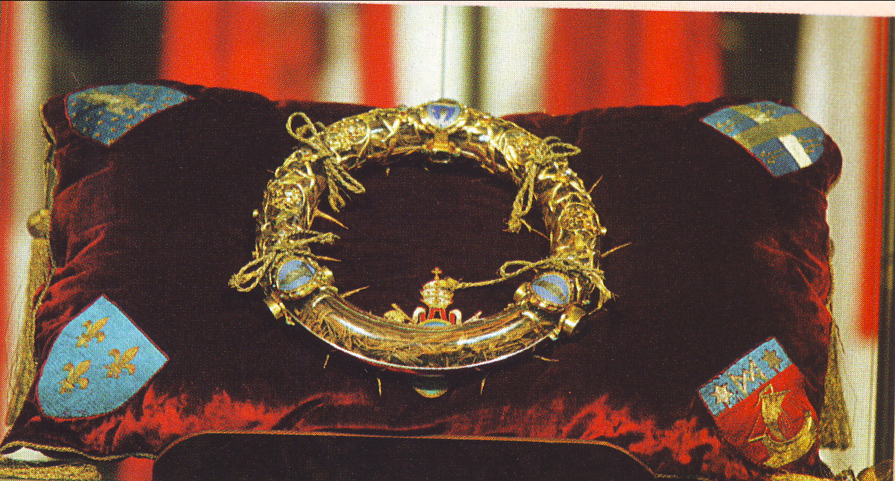 I soldati continuarono poi a schernire Gesù mascherandolo da re ponendogli in testa una corona di spine, in mano una canna e un mantello rosso sulle spalle. Di questi oggetti rimane la corona di spine conservata a Parigi presso la Saint Chappele. Questo capolavoro di arte gotica fu costruito da San Luigi per conservare religiosamente la corona di spine che cinse il capo di Cristo. Il pio re francese la ebbe in dono dall’Imperatore Latino di Costantinopoli come ringraziamento per il prestito di una gran somma di denaro. Molte spine furono donate nel corso del tempo a chiese e santuari, cosicché ci sono molti luoghi in Europa che si vantano di possederne almeno una! A Roma 2 spine sono conservate nella Chiesa di Santa Croce in Gerusalemme. A seguito della forte devozione dei re francesi per la sacra corona si iniziò a dipingere il Cristo crocifisso coronato di spine.