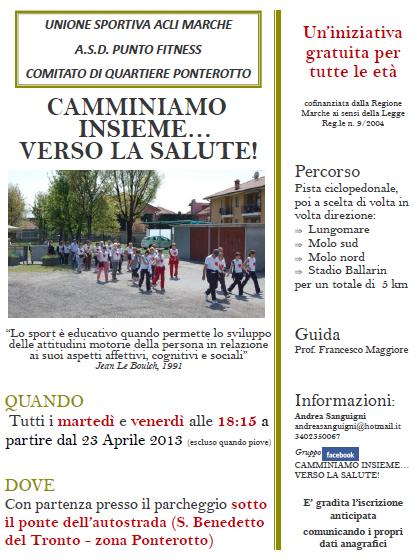 SAN BENEDETTO DEL TRONTO – “Camminiamo insieme… verso la Salute”. E’ questa una nuova iniziativa che l’U.S. Acli Marche, in collaborazione con il Comitato di quartiere Ponterotto e l’ASD Punto Fitness, ha programmato per le prossime settimane.