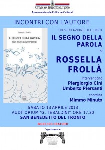 SAN BENEDETTO DEL TRONTO– Si chiama “Il segno della Parola. Poeti italiani contemporanei” l’antologia di poesia curata da Rossella Frollà che verrà presentato domani, sabato 13 aprile, alle 17,30, in Auditorium Comunale.