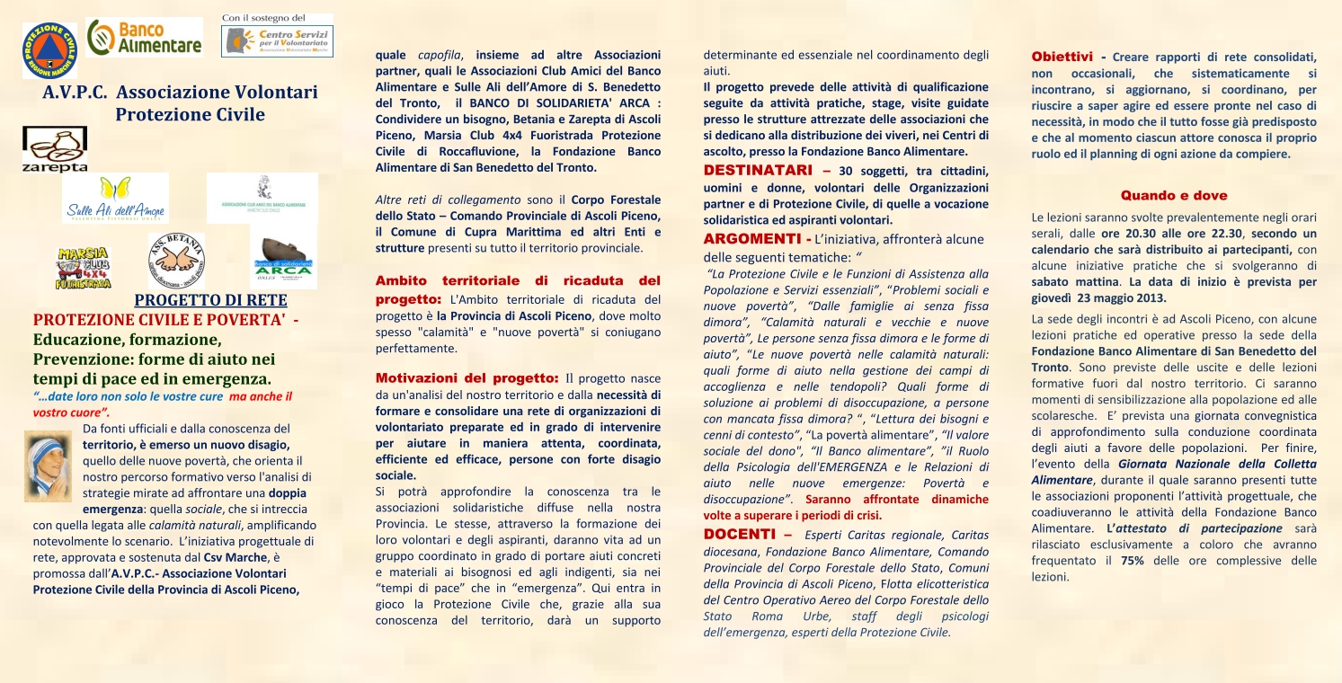 Al fine di promuovere l’iniziativa di solidarietà sul territorio e suscitare l’interesse della popolazione verso le tematiche della Solidarietà, del Banco alimentare, della Protezione Civile e del Volontariato, tutta la giornata di mercoledì 24 aprile 2013 verrà allestito uno spazio strategico informativo all’interno del Centro Commerciale “Porto Grande” di Porto D’Ascoli, sito in Via Pasubio, dove sarà distribuito del materiale divulgativo messo a disposizione dalle associazioni partners del progetto, quali quelle di Protezione Civile, il Club Amici del Banco Alimentare e Sulle Ali dell’Amore di S. Benedetto del Tronto, Betania, il Banco di Solidarietà – Arca e Zarepta di Ascoli Piceno, Marsia Club 4×4 Fuoristrada Protezione Civile di Roccafluvione, oltre altre reti di collegamento come il Corpo Forestale dello Stato – Comando Provinciale di Ascoli Piceno, del Comune di Cupramarittima e di altri Enti, Comuni e strutture presenti su tutto il territorio provinciale.