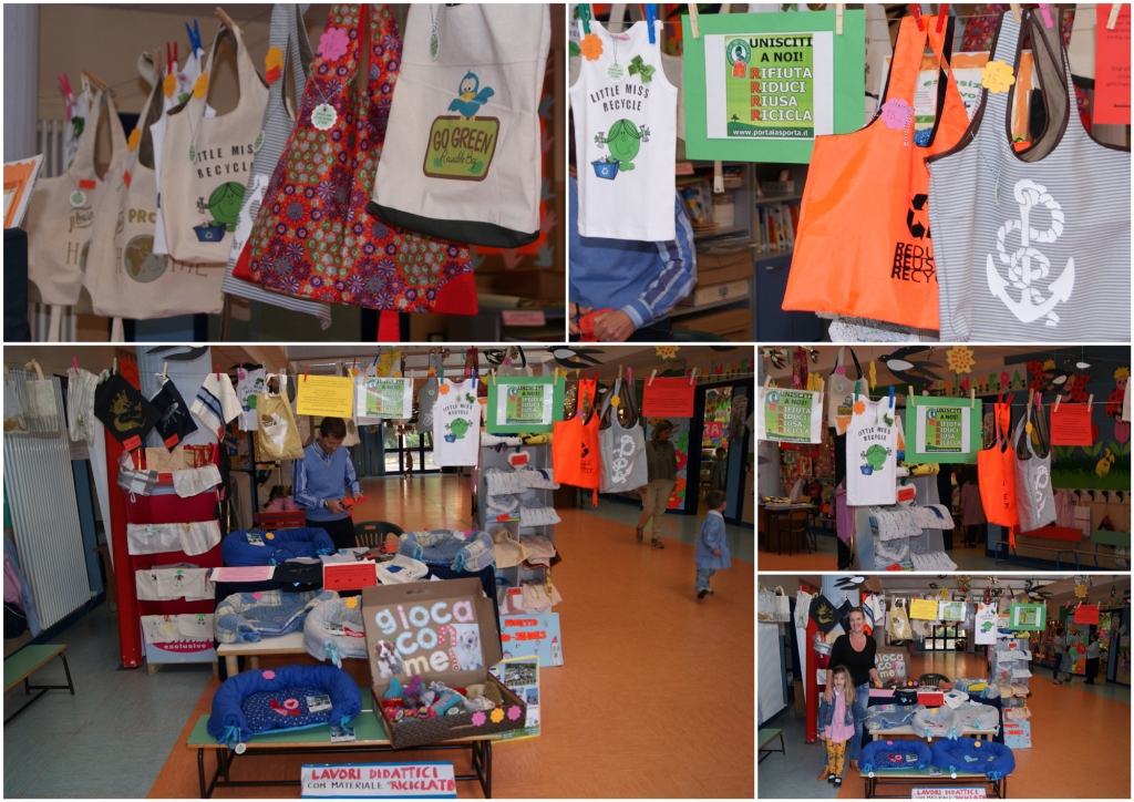 – bancarelle organizzate dai genitori sul tema delle borsette/sportine riutilizzabili per la spesa realizzate con materiale di scarto nei plessi della scuola primaria ed infanzia.